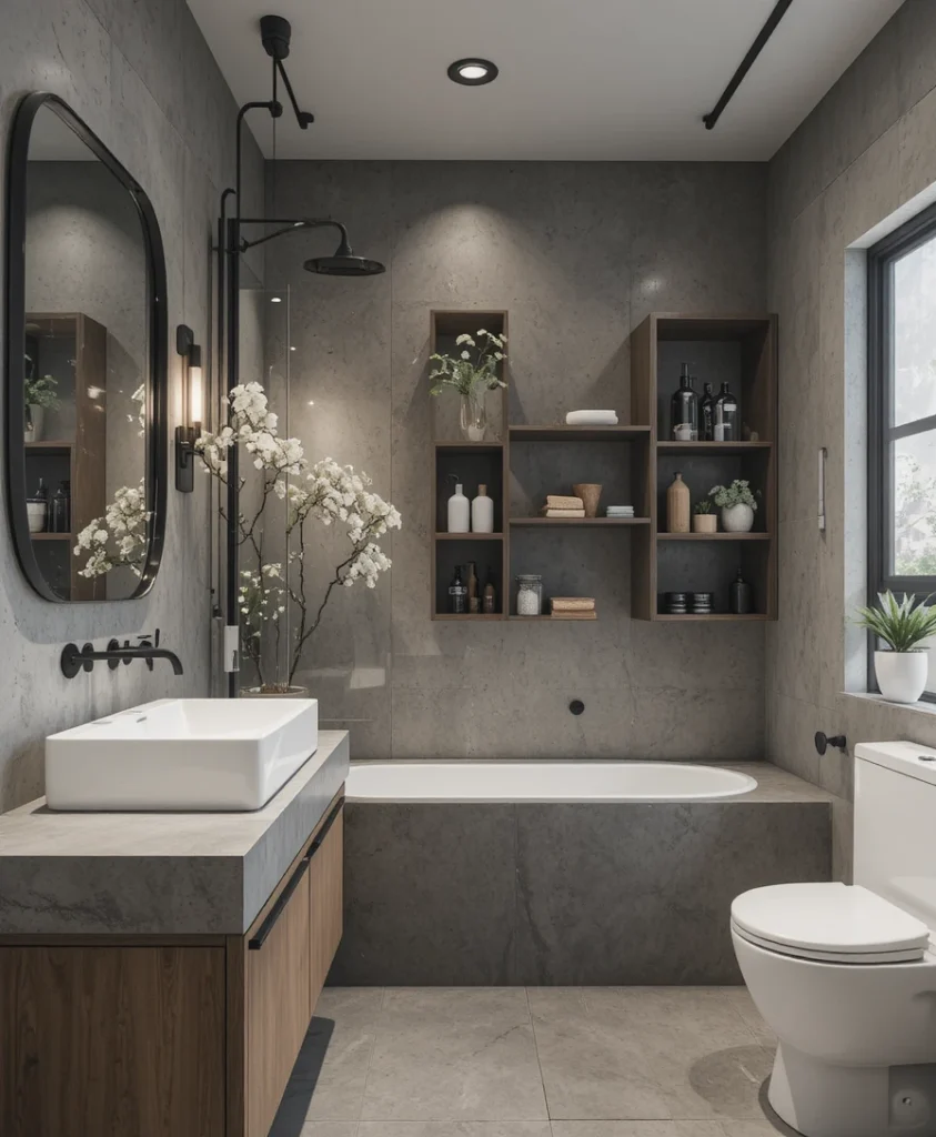 An industrial bathroom remodel features raw textures like concrete, metal, and exposed elements. Matte finishes and open shelving create an edgy yet refined look suitable for urban interiors.