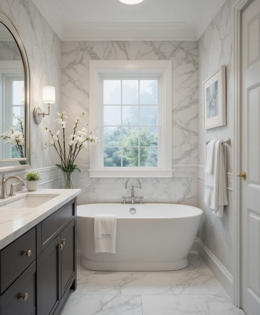 Marble remains a classic choice in a bathroom remodel. Its natural veining adds sophistication and brightness to the space. Use marble for countertops, walls, or flooring to create a refined and enduring aesthetic.