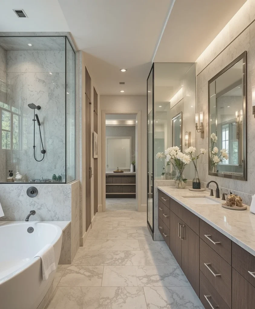 An open-layout bathroom remodel blends seamlessly with adjoining spaces. Glass partitions and minimal barriers enhance flow. This concept works well in master suites.