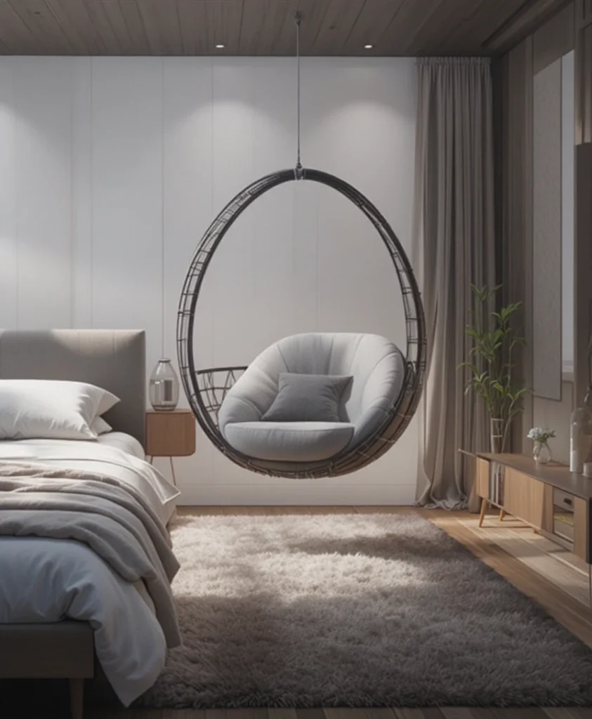 Floating frame chairs, where the seat appears suspended, are standout bedroom chair ideas 2026. These designs create visual openness and work beautifully in modern or minimalist interiors. The airy structure makes the bedroom feel larger while still offering comfortable seating.