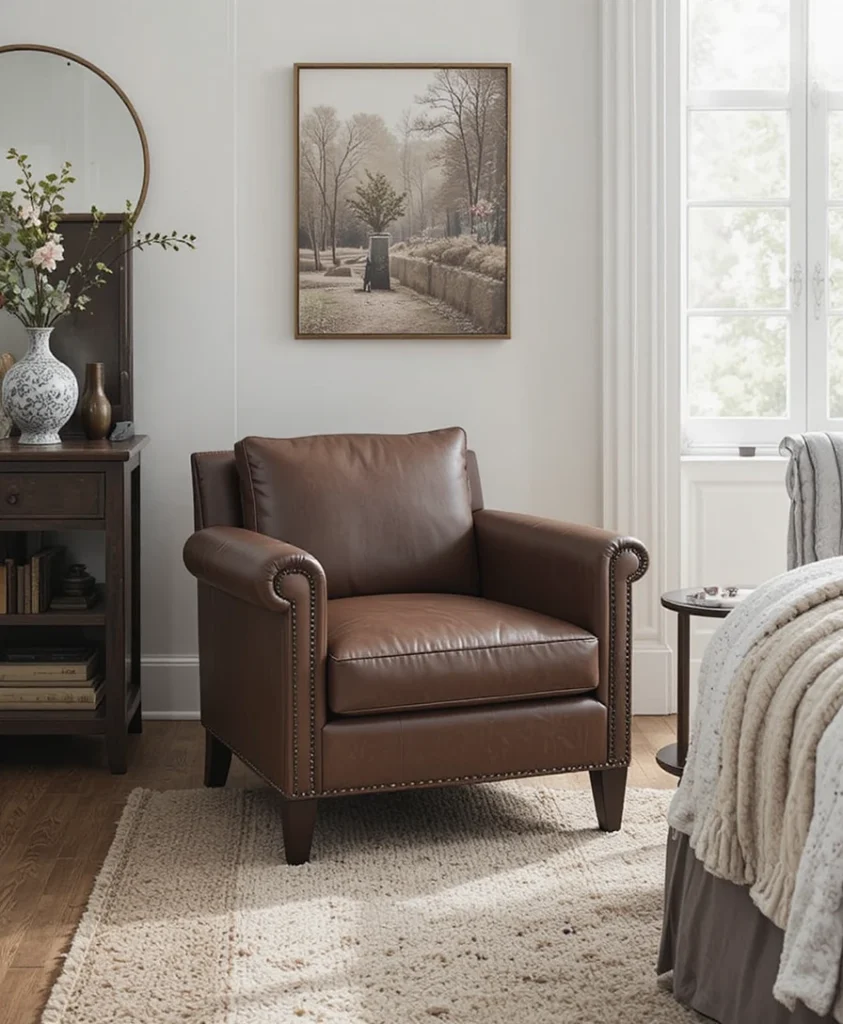 Leather chairs bring understated luxury to bedroom chair ideas 2026. Soft, matte leather in warm browns or muted blacks adds character and durability. These chairs age beautifully, making them an investment piece that enhances both modern and classic bedrooms.