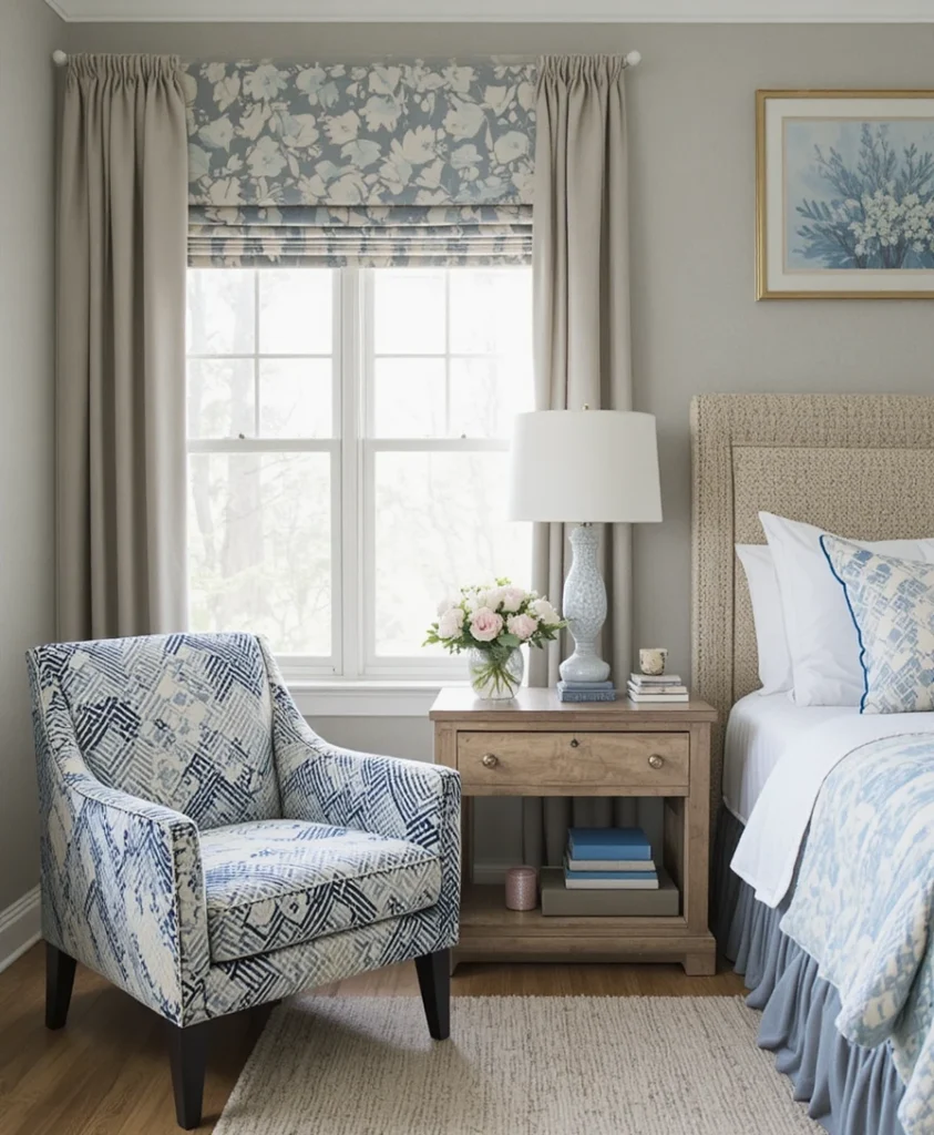 Patterned upholstery adds character to bedroom chair ideas 2026. Subtle geometrics, abstract prints, or nature-inspired motifs introduce visual movement. When used thoughtfully, patterned chairs elevate the bedroom without overpowering other design elements.