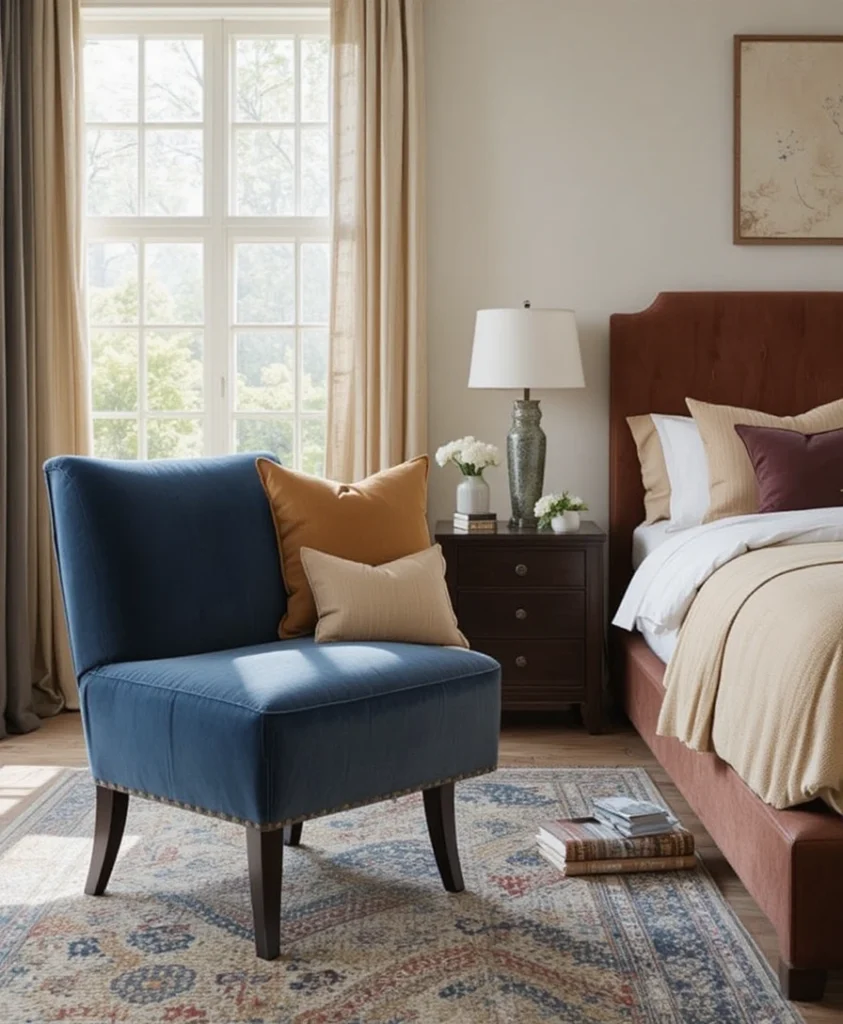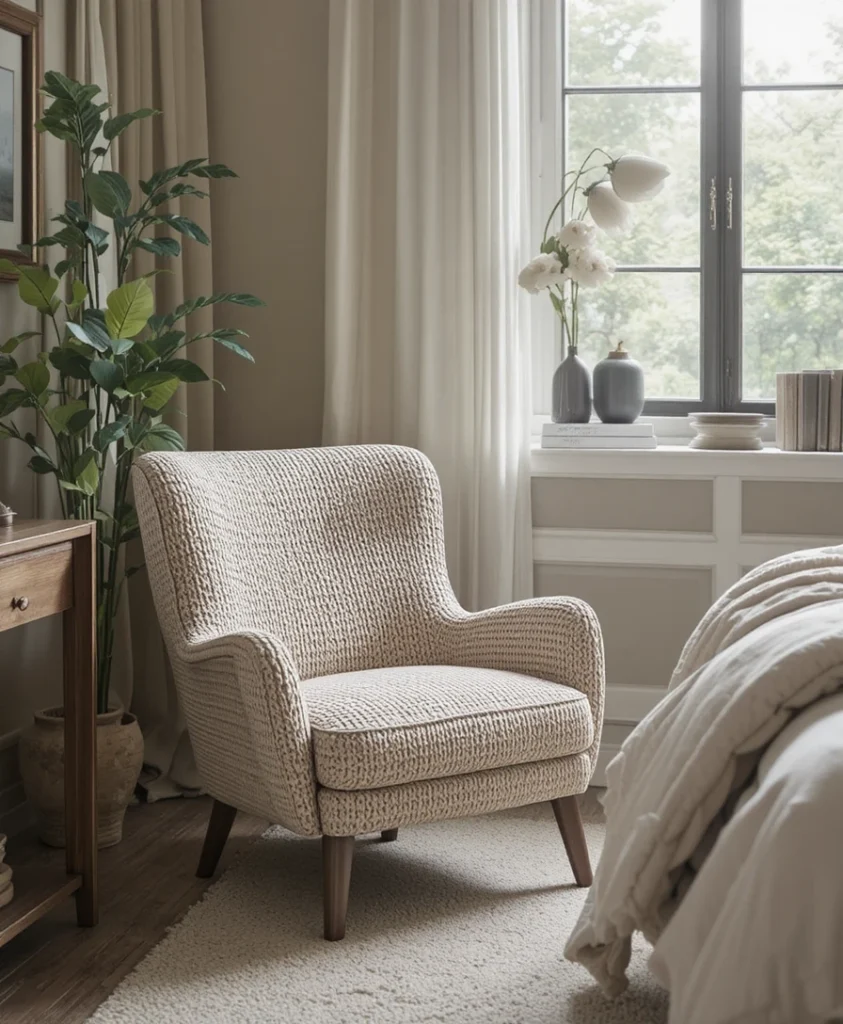 Bedroom chair ideas 2026 encourage personality through color. A bold statement chair in mustard, terracotta, or deep blue becomes a focal point. This approach works especially well in neutral bedrooms, where a pop of color adds energy without overwhelming the space.