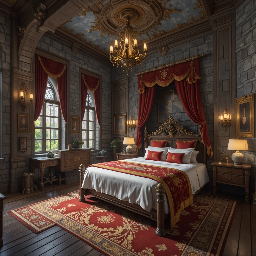 A castle-inspired bedroom uses banners, chandeliers, and detailed stonework. Beds framed with gold and red accents turn this idea into a grand chamber fit for royalty.