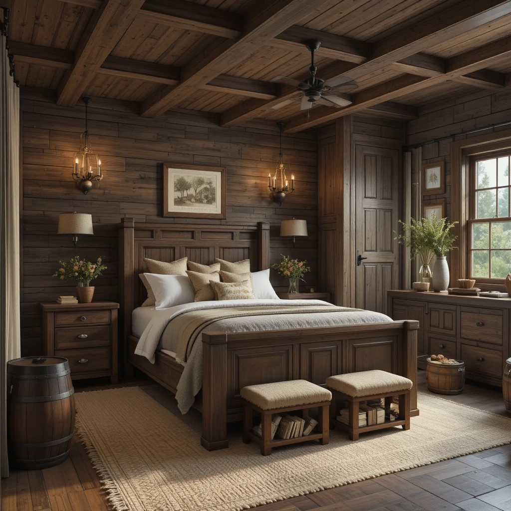 Using dark oak, barrels, and hay block decorations creates a farmhouse vibe. This cozy room design captures countryside charm while offering practical storage solutions.