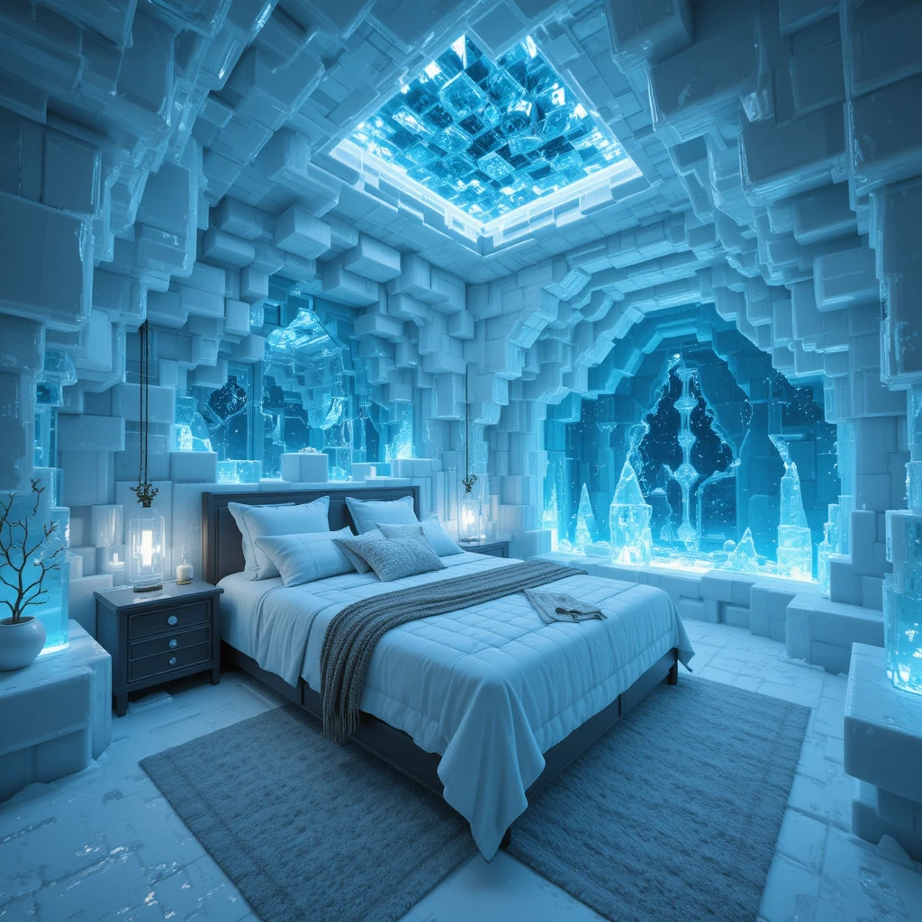 Packed ice, snow blocks, and blue glass form a shimmering icy interior. The frozen, magical feel of this bedroom makes it a spectacular and unique design.