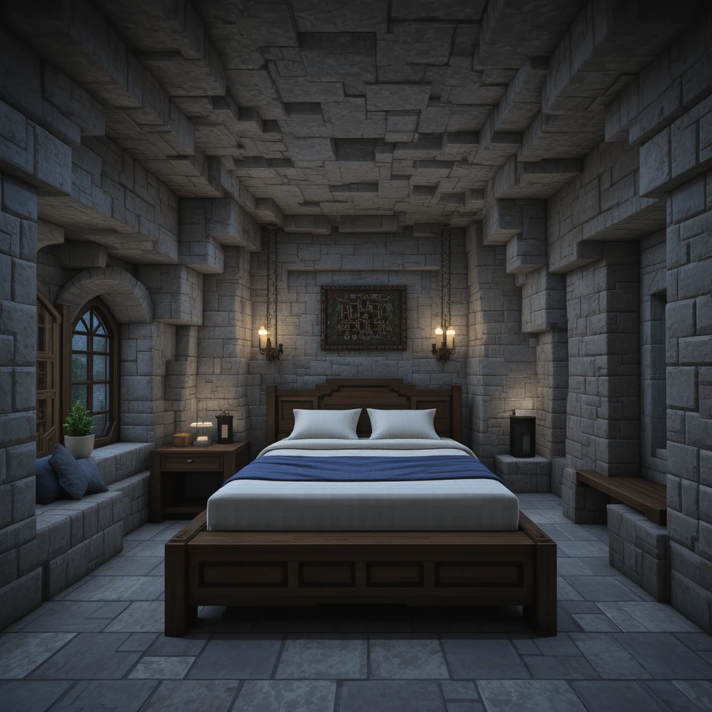 Carving a bedroom beneath the surface adds a mysterious atmosphere. Smooth stone walls, dim torches, and hidden nooks give this design a unique, dungeon-like feel, blending function with intrigue.
