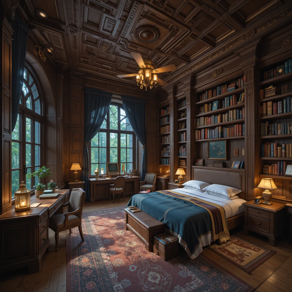 A library-themed bedroom feels intellectual and cozy, with towering bookshelves, enchanting tables, and a reading nook. This style enhances the aesthetic while adding functionality for enchanting gear.