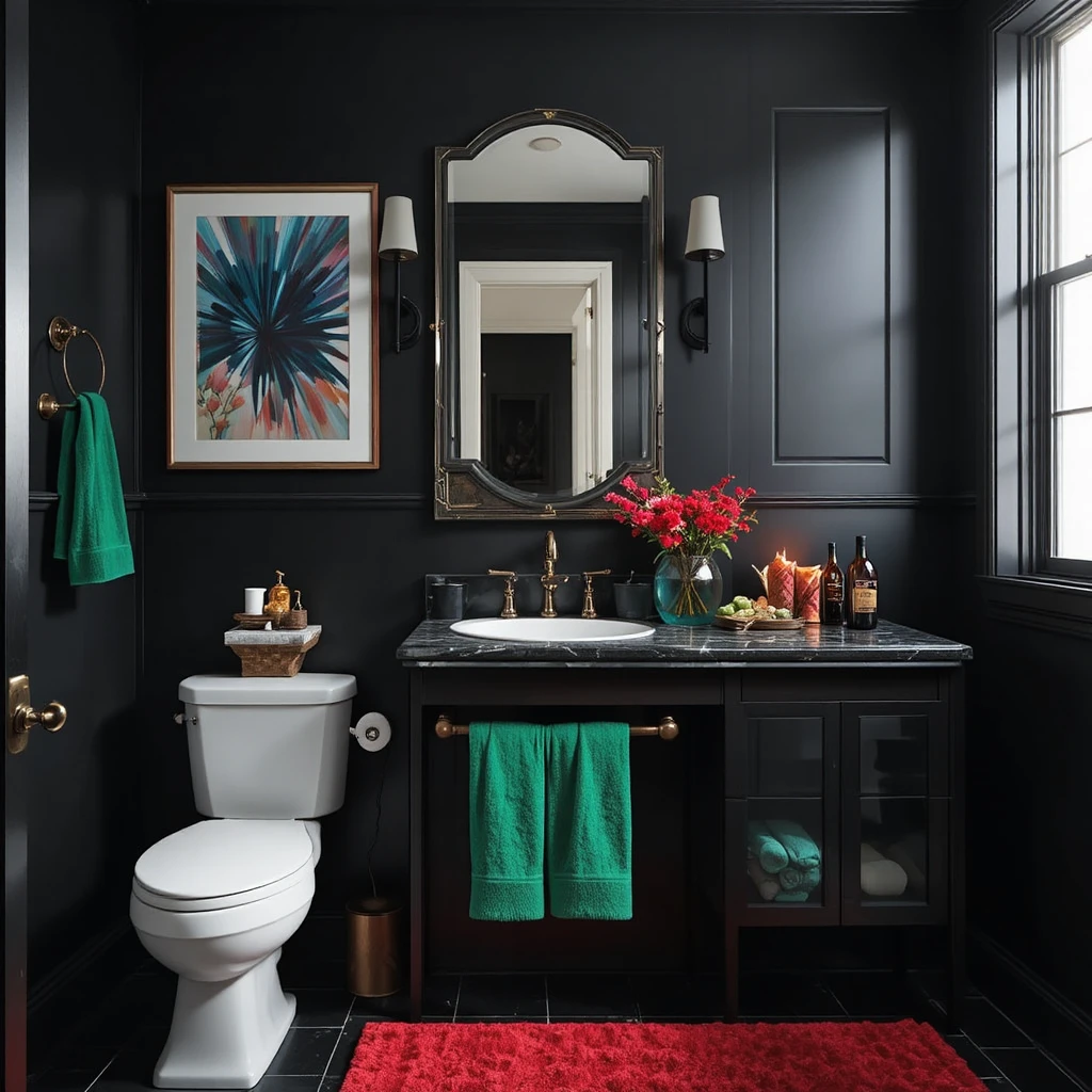 Introduce a bold accent color like emerald green, ruby red, or royal blue through towels or art pieces. The vibrant tones create stunning contrast within the black bathroom, elevating its personality and uniqueness.