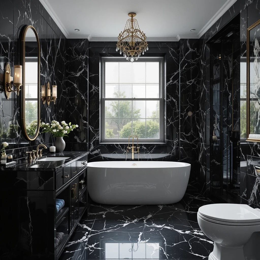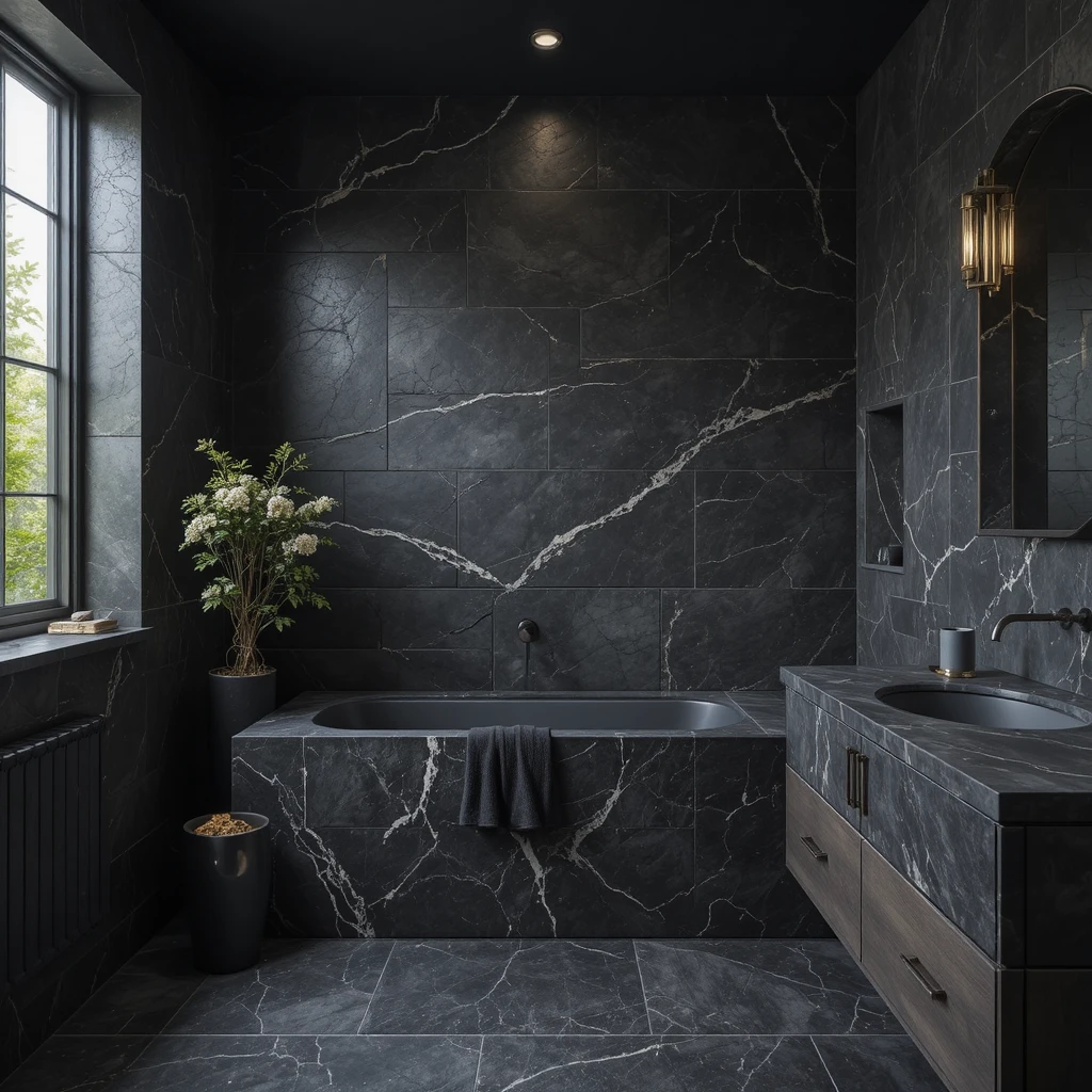 Nothing speaks of luxury like black marble. Whether used for countertops, walls, or flooring, the natural veins add character and opulence. A black bathroom with marble accents feels elegant yet grounded, perfect for modern and classic interiors alike.