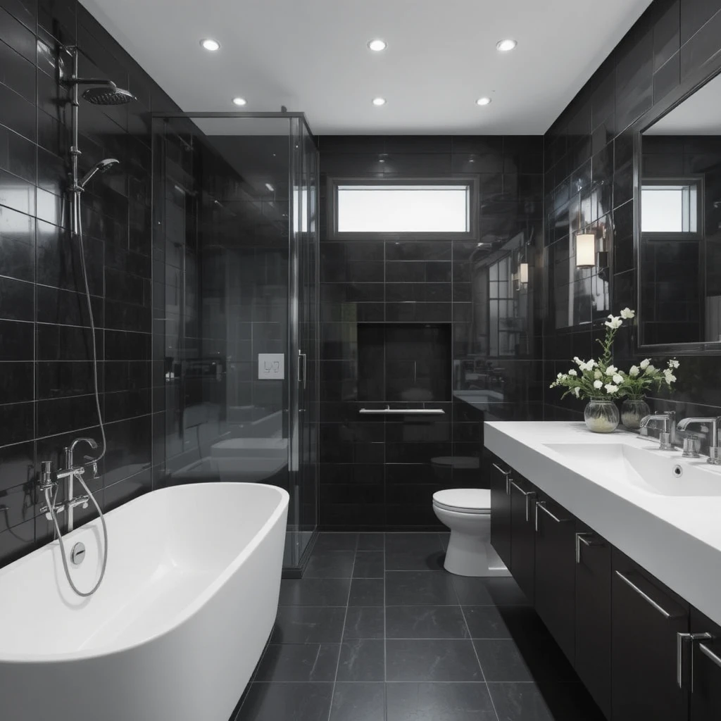 Balance the darkness of black tiles with crisp white bathtubs or sinks. The contrast instantly creates visual interest and prevents the space from appearing too heavy. A monochromatic black and white bathroom never goes out of style.