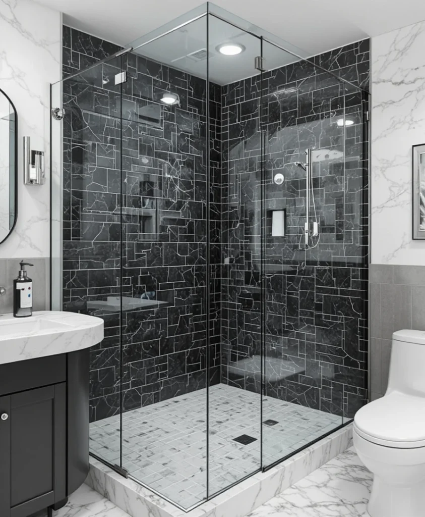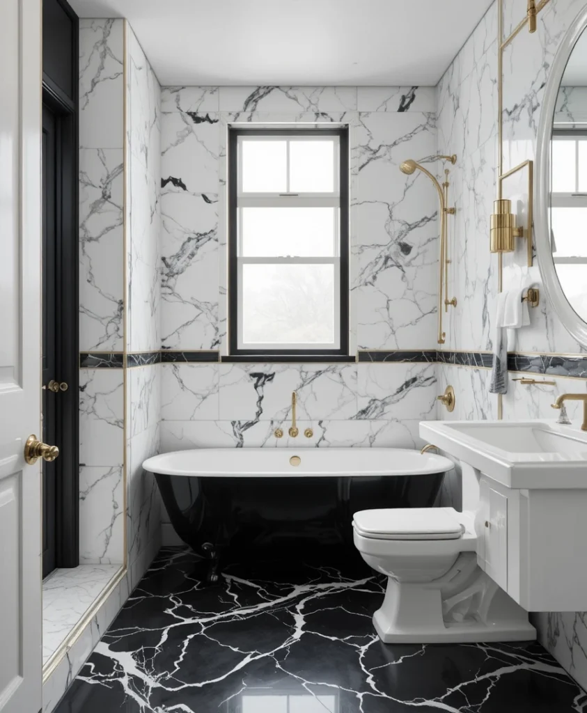 Marble instantly elevates any bathroom. Use black and white marble tiles for the floors and shower walls to add a luxurious flair. Pair it with sleek gold or chrome fixtures for a touch of warmth and sophistication.