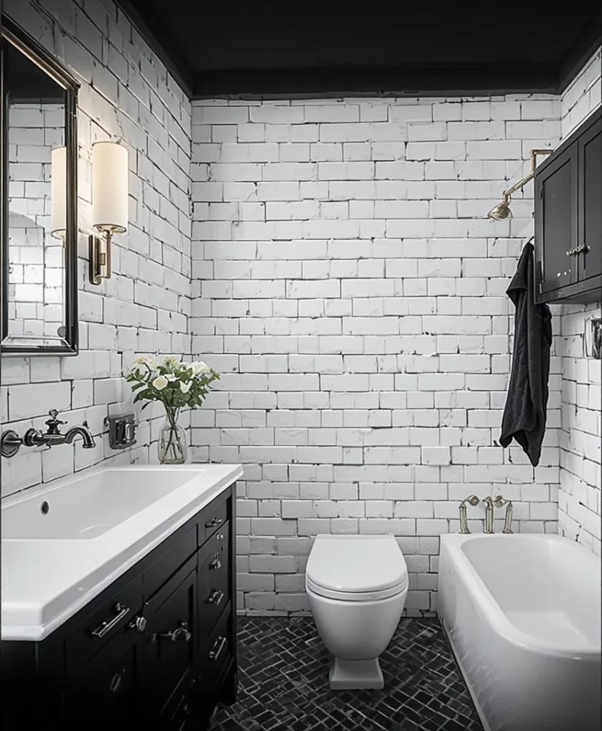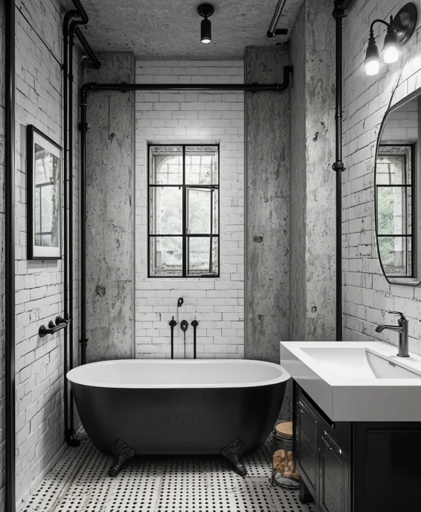 Use exposed black pipes, concrete walls, and white tiles to create an industrial-inspired space. It’s raw, edgy, and effortlessly stylish—perfect for a black n white bathroom with a masculine vibe.