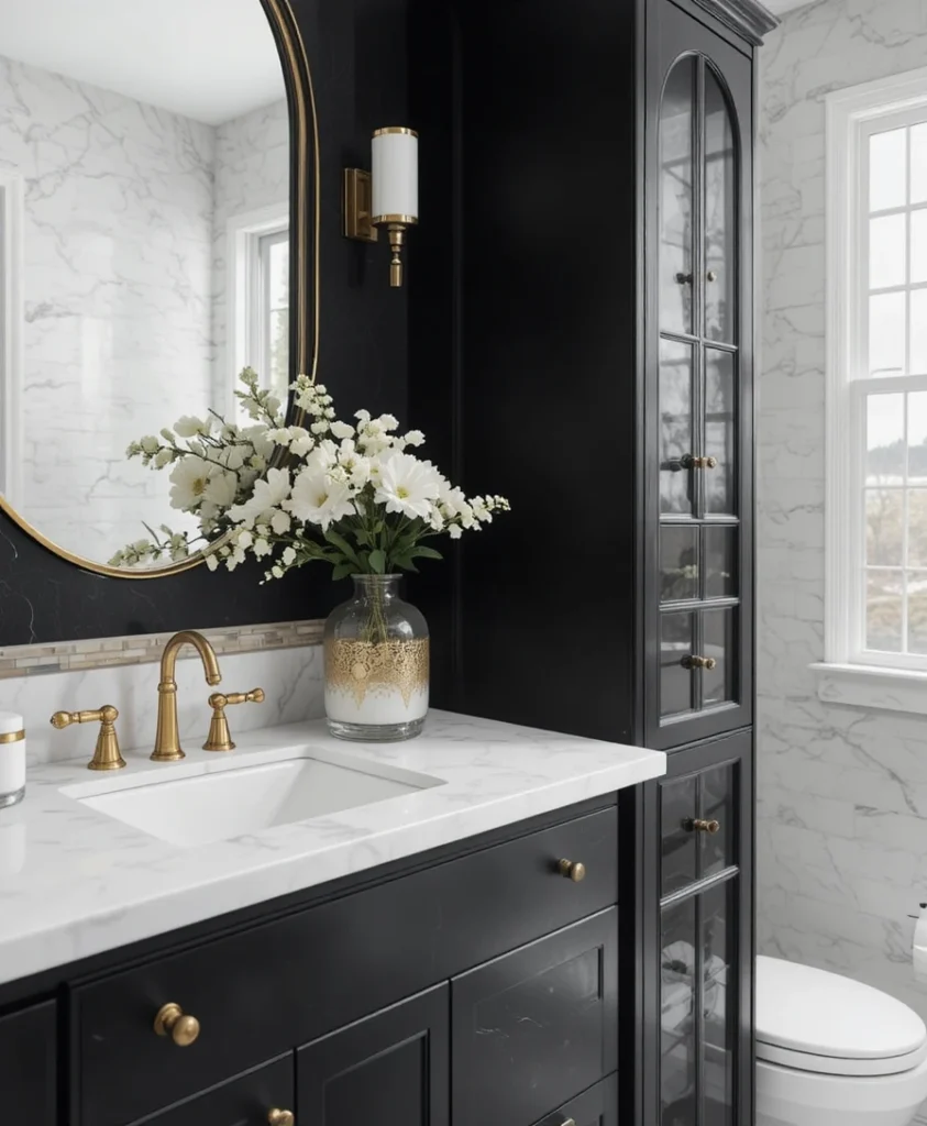 Black vanities paired with gold knobs and faucets instantly elevate the luxury level. This combination blends glamour with monochrome sophistication for a refined modern look.