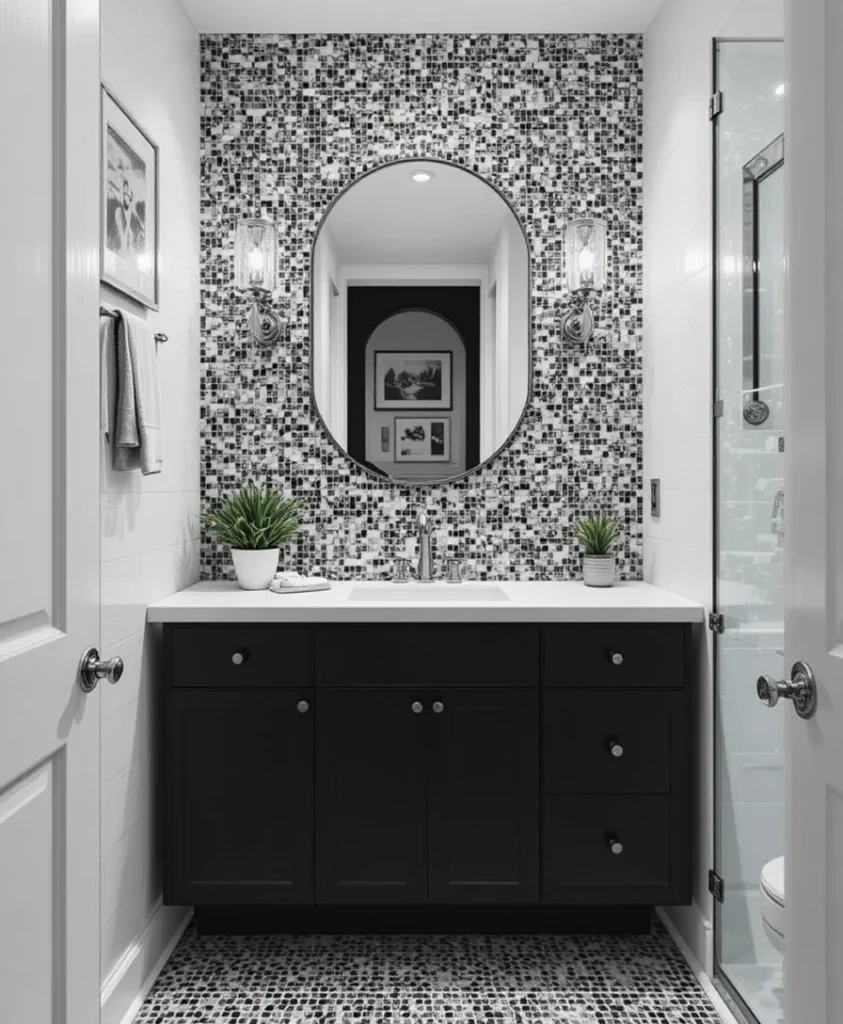 Use mosaic tiles that combine black, white, and gray tones for your backsplash or shower area. This design adds visual texture and depth without overpowering the minimalist theme.