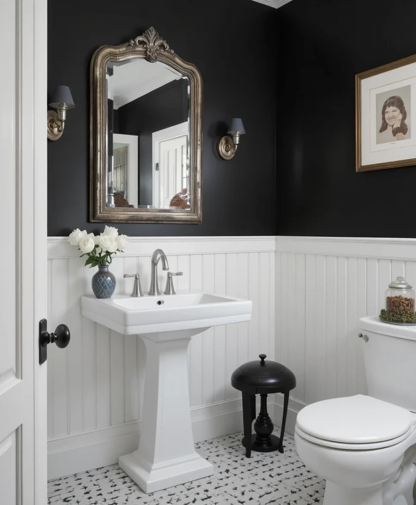 This idea adds a refined, traditional touch. The white lower paneling keeps the room bright, while black upper walls lend contrast and balance for a sophisticated finish.