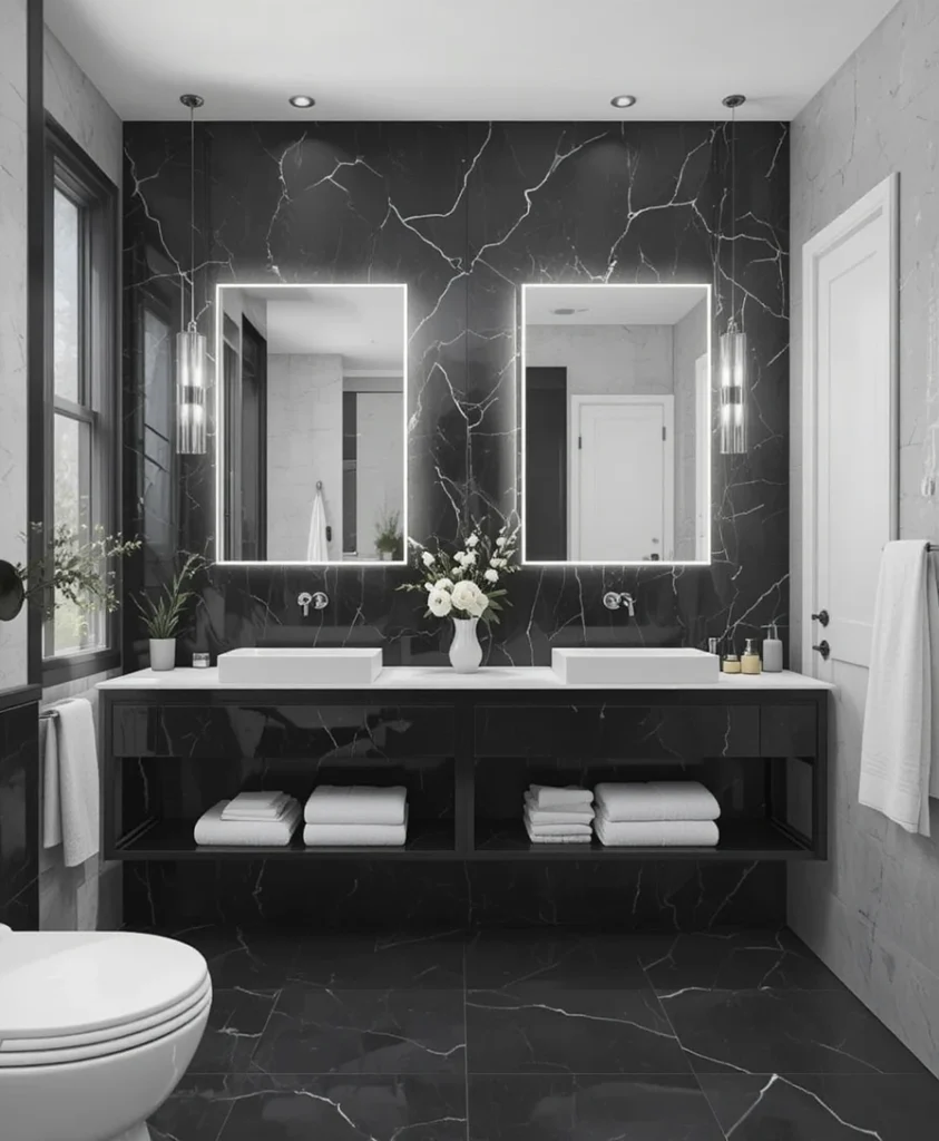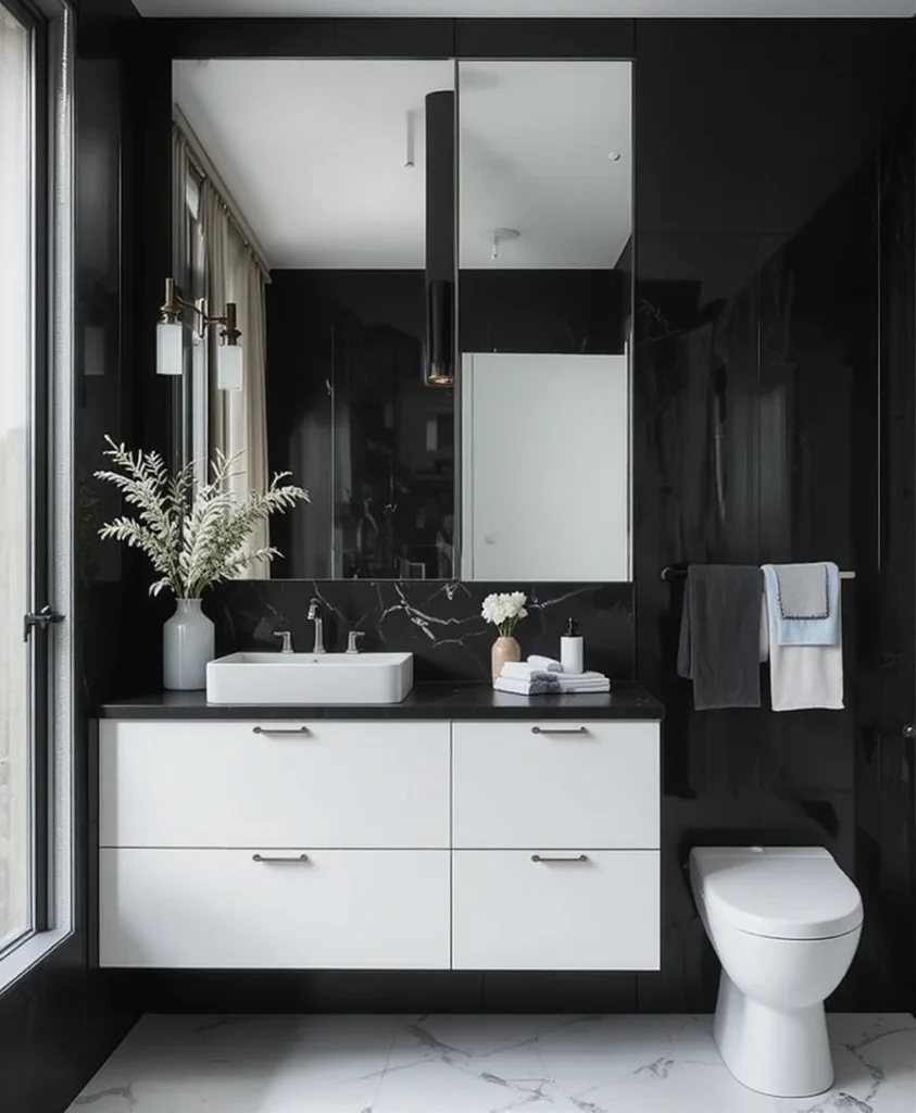 Create a focal point by painting one wall in matte black or installing textured black tiles. This striking backdrop can make your mirrors, sinks, or art pop while keeping the rest of the space light and balanced.