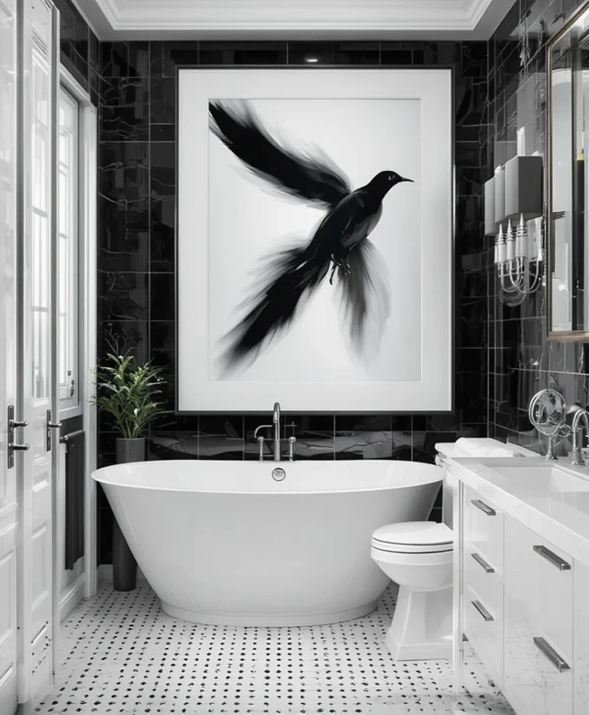 Complete the space with modern art pieces in black frames or monochrome tones. Art adds personality, telling a story and transforming your black n white bathroom into a statement of taste and creativity.