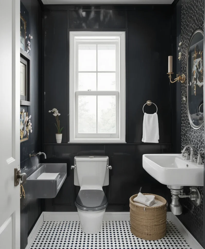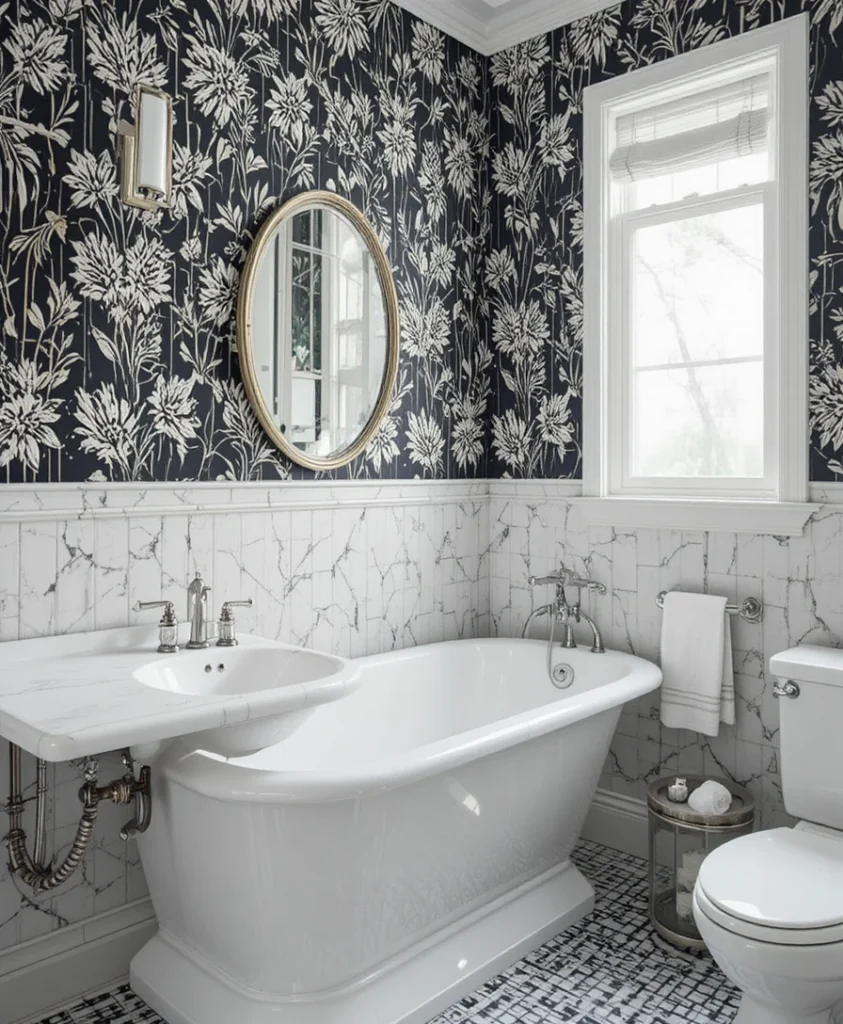Add visual excitement with patterned wallpaper—think geometric prints, florals, or art deco motifs. This idea adds character without overwhelming the minimalist appeal of a black n white bathroom.
