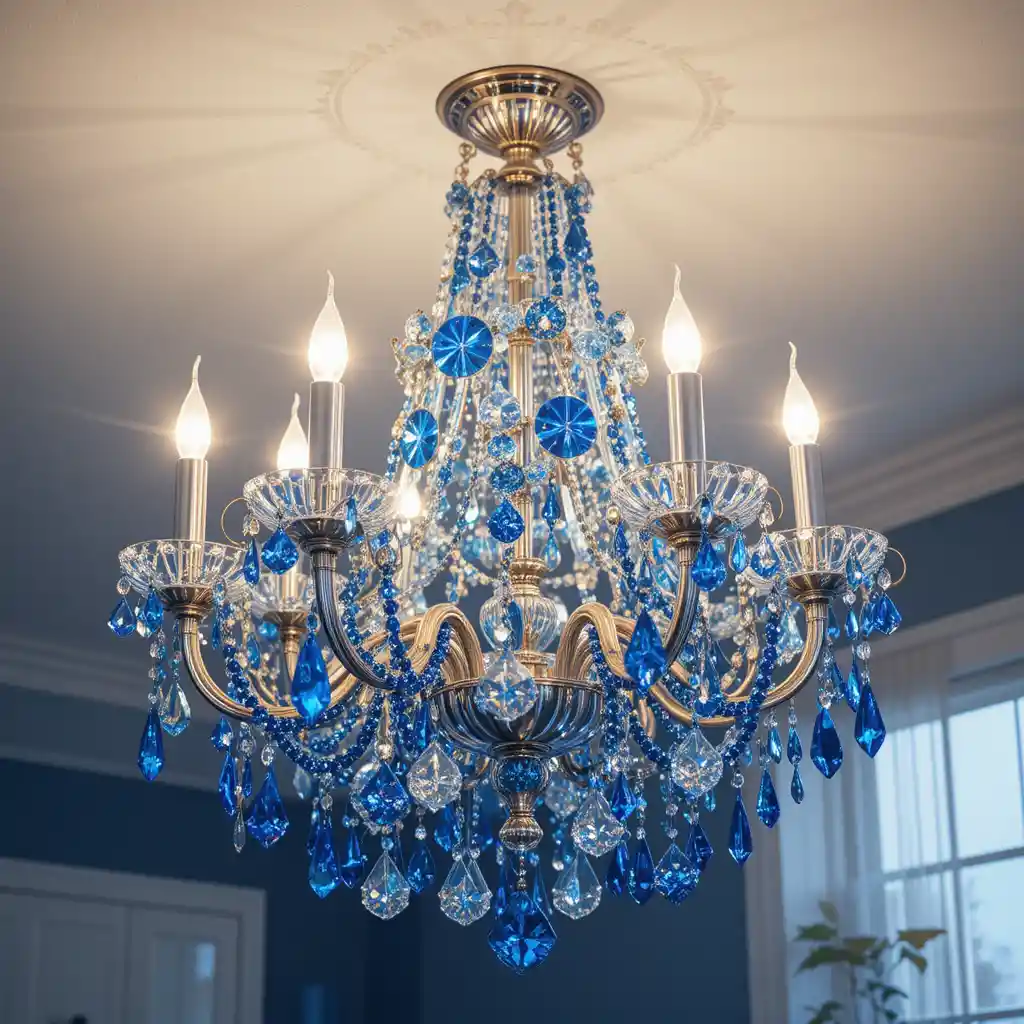 Adorn your chandelier with dangling blue crystal ornaments. The sparkling prisms catch the light beautifully, making your ceiling a showstopper during holiday gatherings.