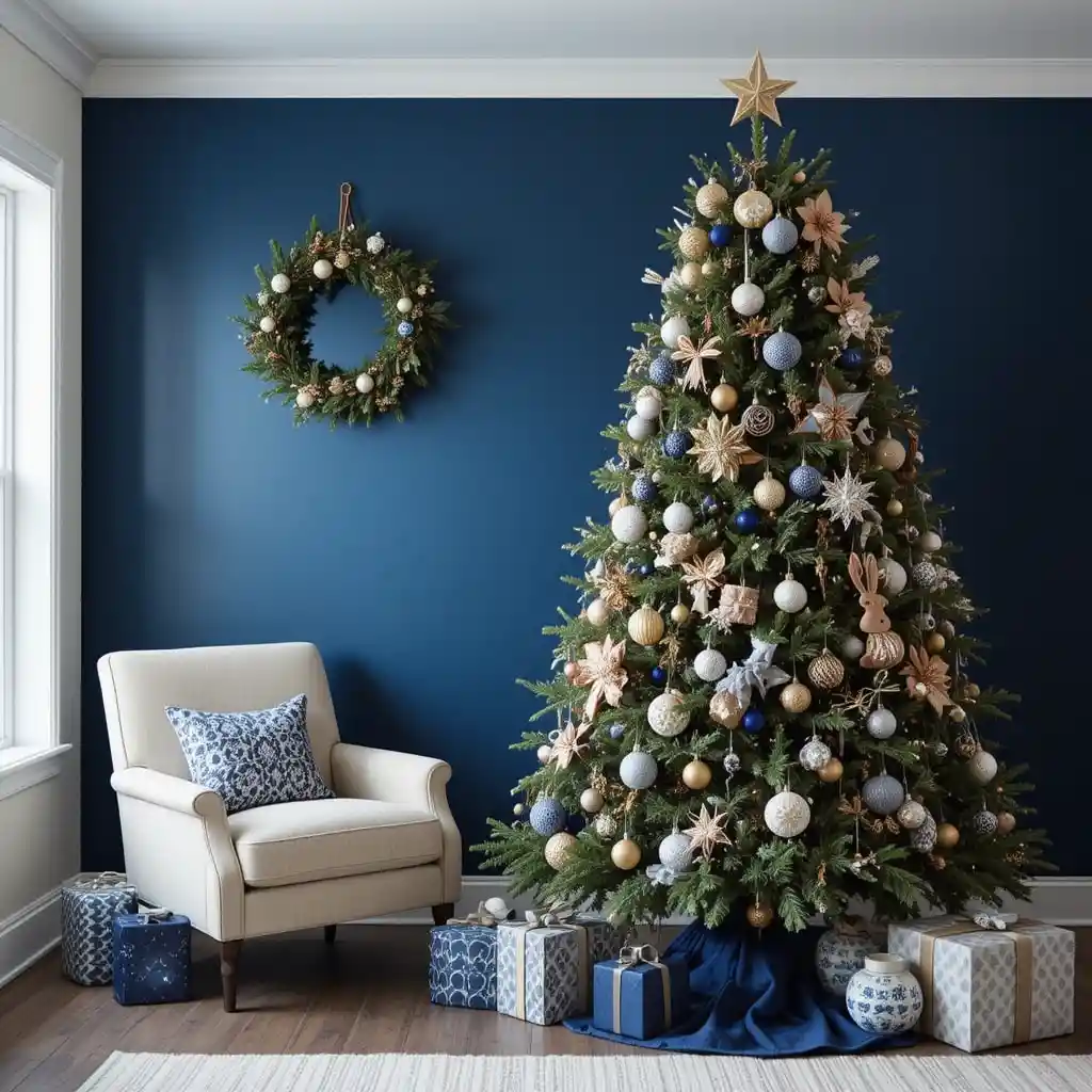 Paint or temporarily cover a wall in navy blue to serve as a bold backdrop for your Christmas tree or holiday portraits. It instantly adds depth and elevates your entire holiday display.
