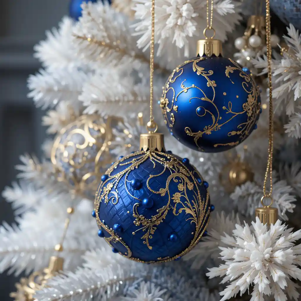 Pair navy or cobalt ornaments with golden accents for a luxurious finish. The gold highlights the richness of blue, creating a regal and timeless design.