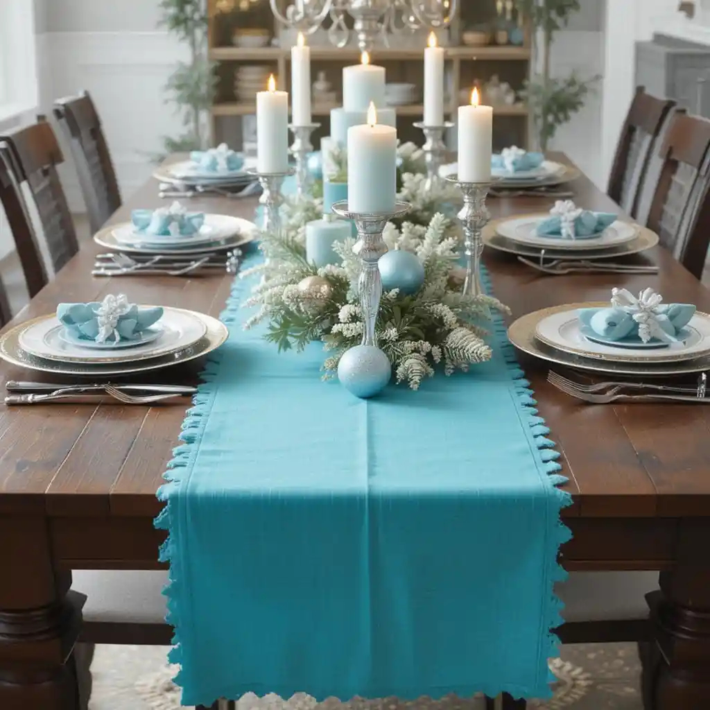 Lay down a turquoise runner across your holiday table with glittering accents. Its lighter tone introduces freshness and blends beautifully with silver candlesticks or frosty greenery.