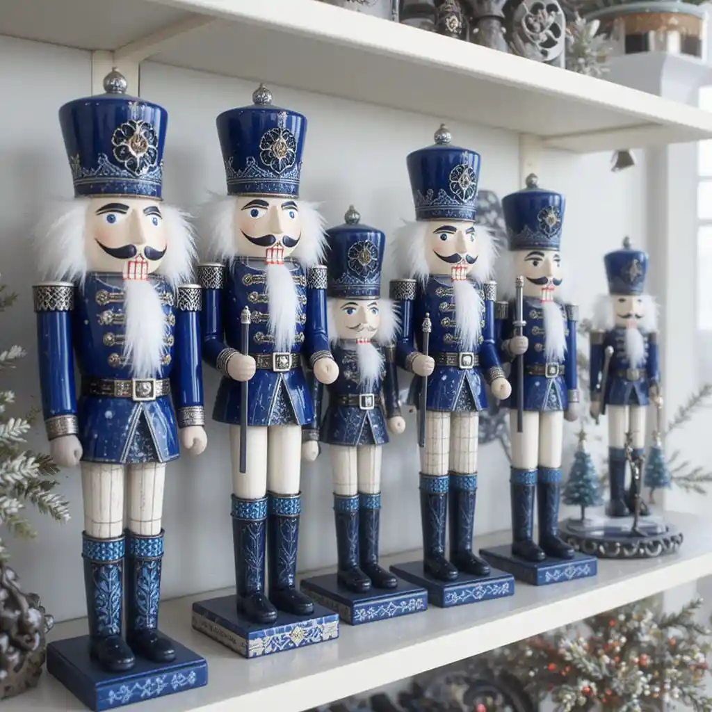 Display nutcrackers dressed in sapphire uniforms or navy attire. This unique twist on a classic holiday decoration adds personality and charm to shelves and entryways.