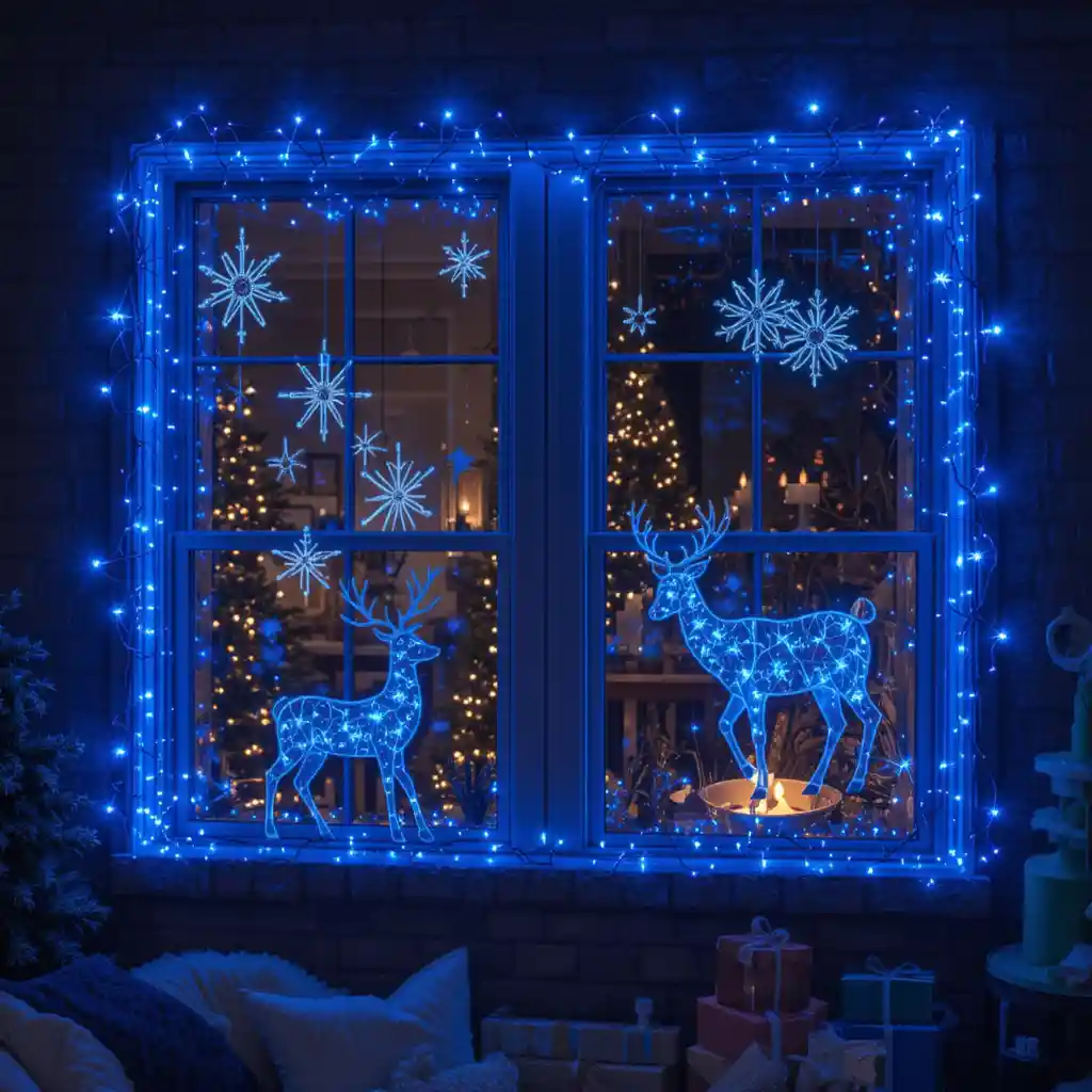 Frame your windows with blue LED silhouettes shaped like stars, reindeer, or snowflakes. These glowing designs add holiday cheer visible both indoors and outside.