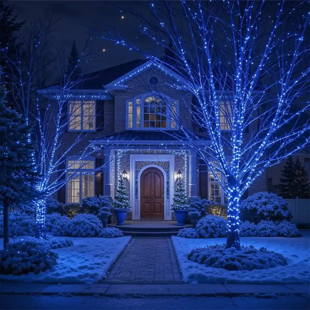 Wrap your outdoor trees and shrubs in royal blue string lights. This bold choice stands out against snow or greenery and creates a spectacular evening view for guests and passersby.