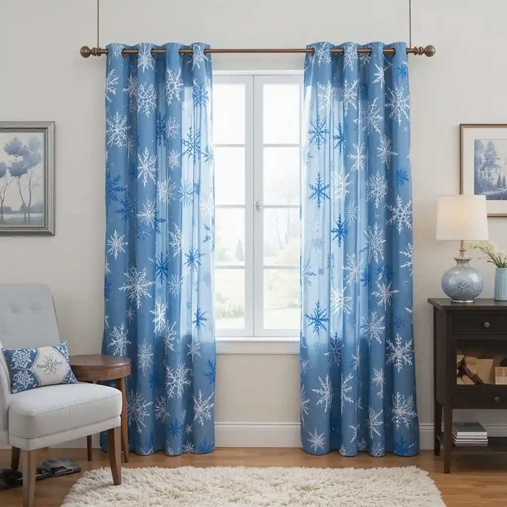 Decorative curtains featuring intricate snowflake patterns in shades of blue add a whimsical winter touch. They instantly transform plain windows into festive focal points.