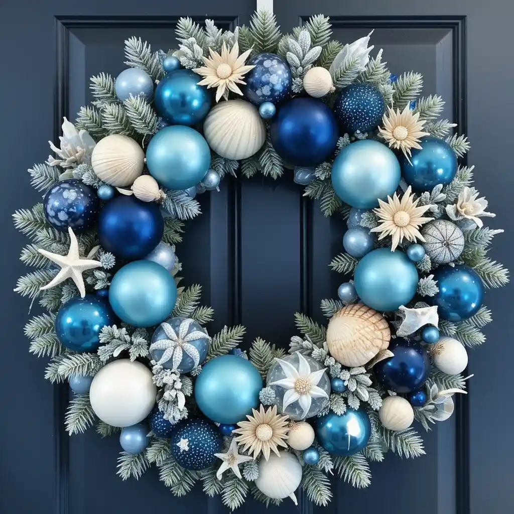 Craft a wreath using aqua and navy ornaments, seashells, and frosted greenery. This creative twist blends seaside vibes with festive holiday energy.