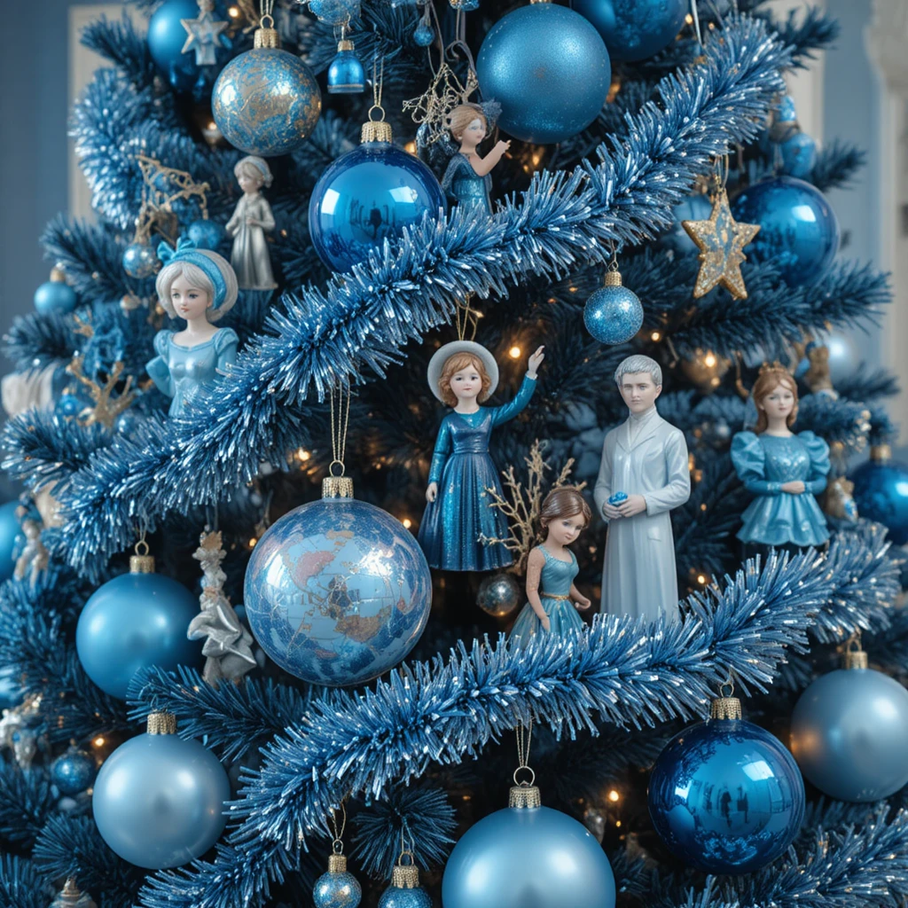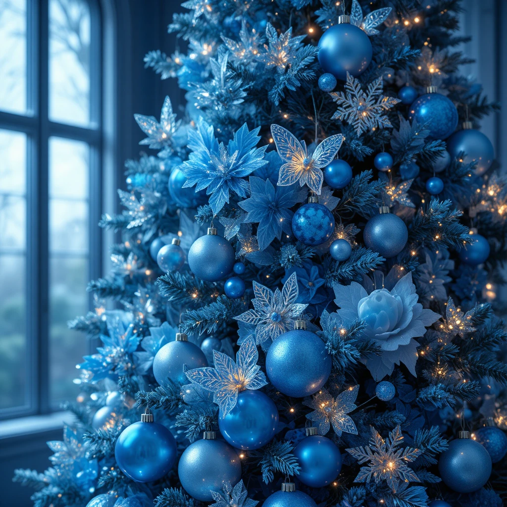 Design a magical blue Christmas tree with iridescent ornaments, shimmering butterflies, and crystal snowflakes. The blend of reflective tones creates a fairytale-like sparkle that captivates every viewer. Soft glowing lights enhance the whimsical nature. This idea is perfect for creating a storybook holiday atmosphere.