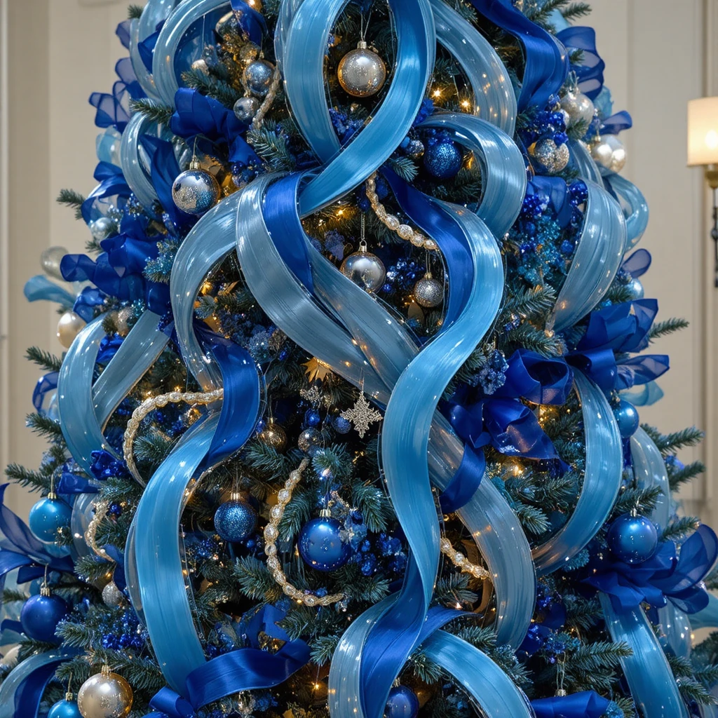 Use different shades of blue ribbon cascading smoothly down the tree to mimic flowing water. The motion and elegance give your blue Christmas tree a dynamic, artistic feel. Add complementary ornaments sparingly to keep the movement the focus. This idea is visually stunning and highly unique.
