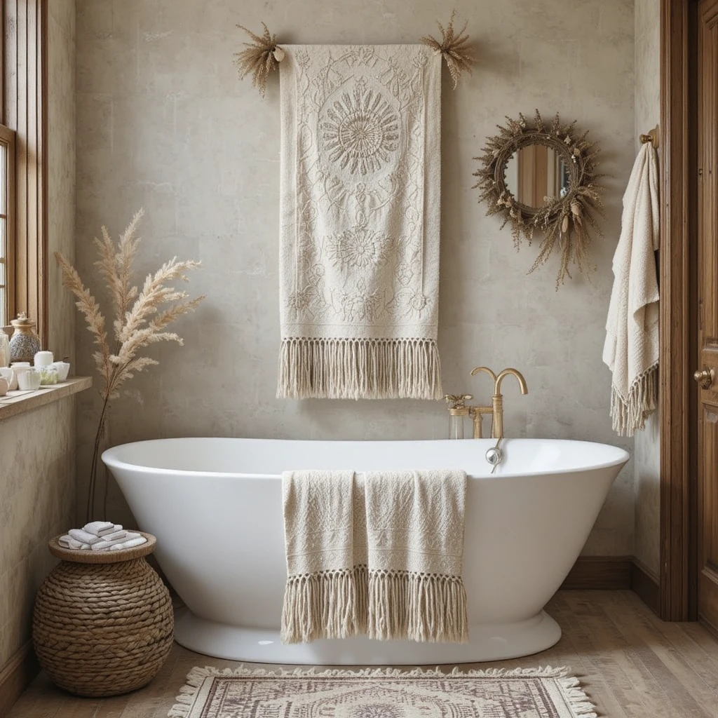 Add towels or décor pieces featuring fringes, tassels, or embroidered edges to intensify texture. These small decorative details infuse whimsy and softness. They elevate your bohemian winter bathroom ideas with artistic flair.
