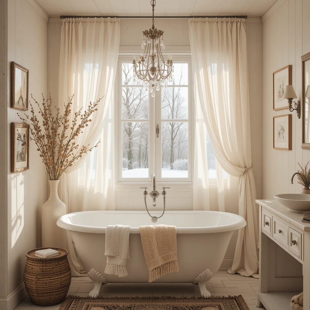 Curate a gallery wall of abstract art, botanical illustrations, or earthy landscapes. Use wooden frames, woven textures, or warm color schemes for consistency. Art transforms your bathroom into a soulful winter retreat.