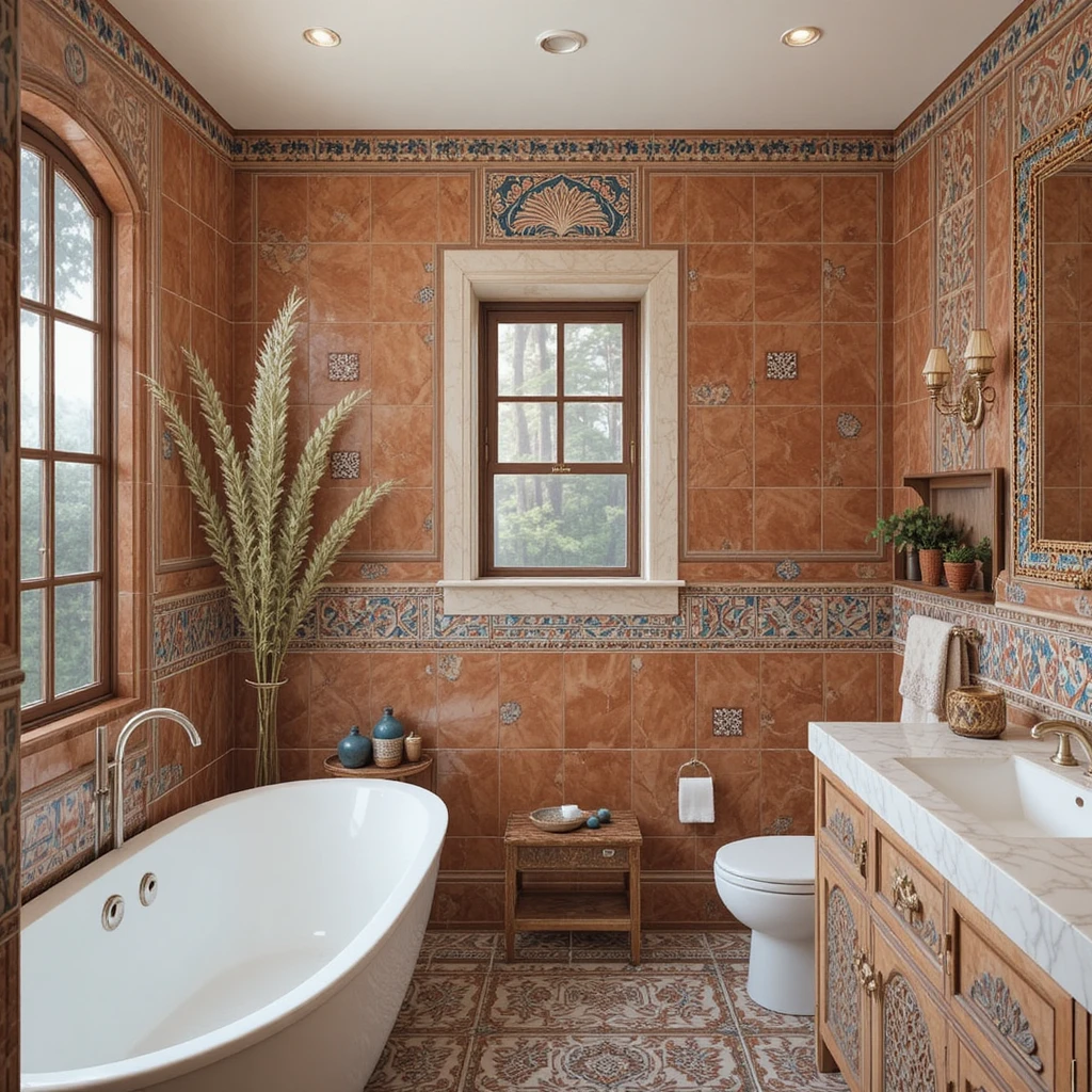 Deep terracotta, warm sand, muted olive, and cinnamon shades create an earthy, soothing environment. These colors feel particularly grounding in winter, making your bathroom radiate a naturally calm energy. This palette beautifully complements the free-spirited charm of bohemian winter bathroom ideas.
