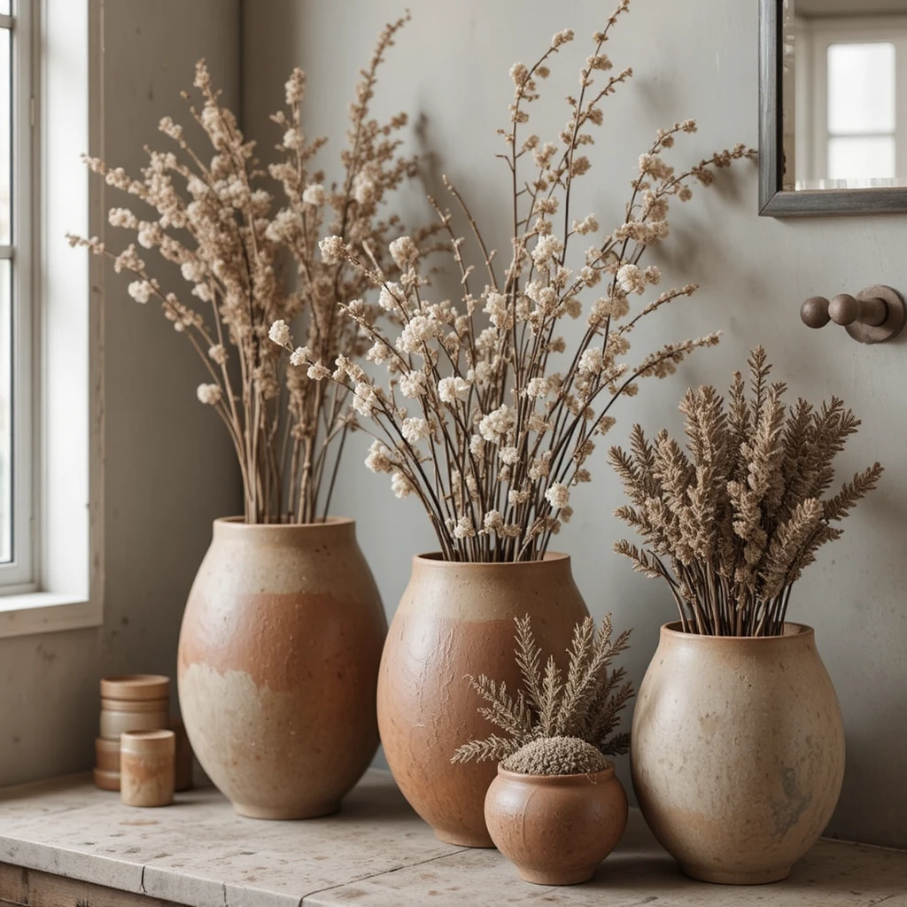 Place plants or dried winter foliage in clay or terracotta pots for a grounded, earthy look. Their matte textures complement warm tones and soften the space. These vessels add a sculptural presence perfect for winter decor.