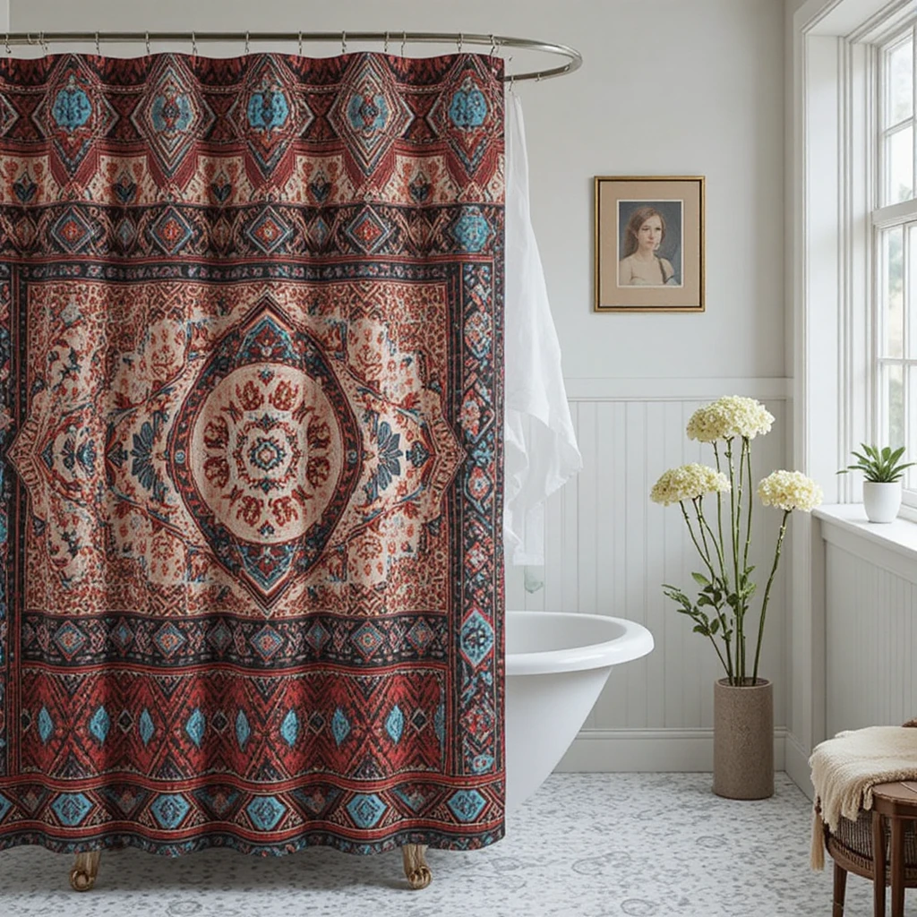 Select richly patterned shower curtains—think tribal prints, geometric motifs, or soft botanical designs. Patterns bring movement and personality while creating a focal point in your bathroom. This artistic detail is a classic element of expressive bohemian winter bathroom ideas.