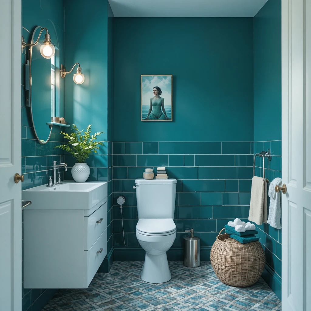 Teal captures the richness of oceanic tones, blending blue and green to create an enchanting colour story. It works beautifully with white ceramic décor or geometric tiles, giving your bathroom a modern coastal vibe with a bold twist.