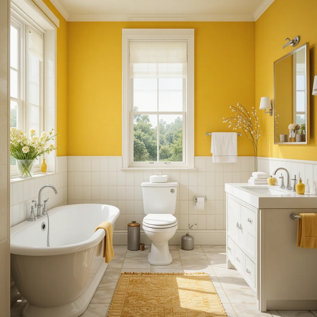 For a cheerful yet bold ambiance, mustard yellow offers depth not found in standard yellows. It brings earthiness and vibrancy at the same time, giving your bathroom a lively and retro-chic appeal. Pair it with matte black for a balanced contrast.
