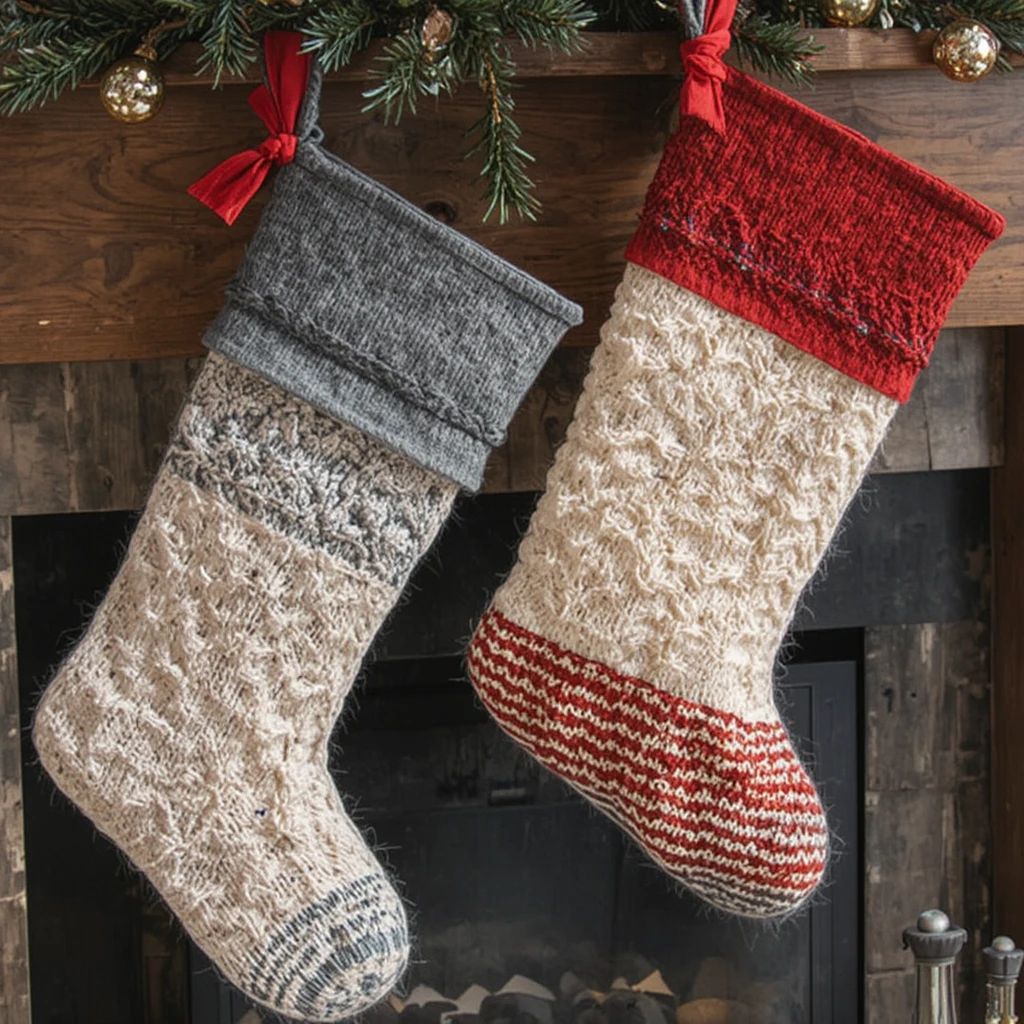 Old sweaters can be cut and sewn into stockings. The textured fabric adds warmth and coziness while giving new life to unused clothing.