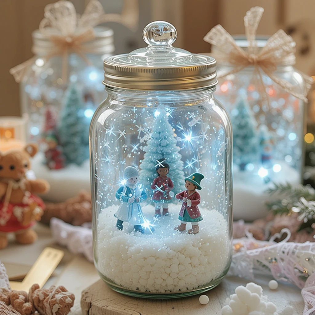 Fill jars with a bit of fake snow, miniature figurines, or tiny ornaments, then seal the lid. These homemade snow globes are charming and cost-effective accents for shelves and tables.
