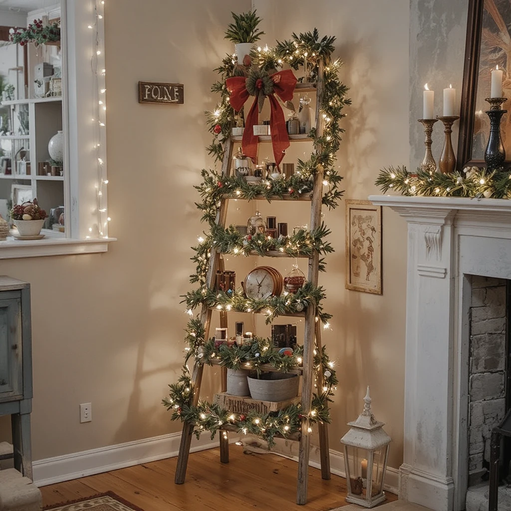 If you own an old wooden ladder, lean it against the wall and decorate it with garlands, lights, and ornaments. It’s a unique alternative to a traditional Christmas tree for small spaces.