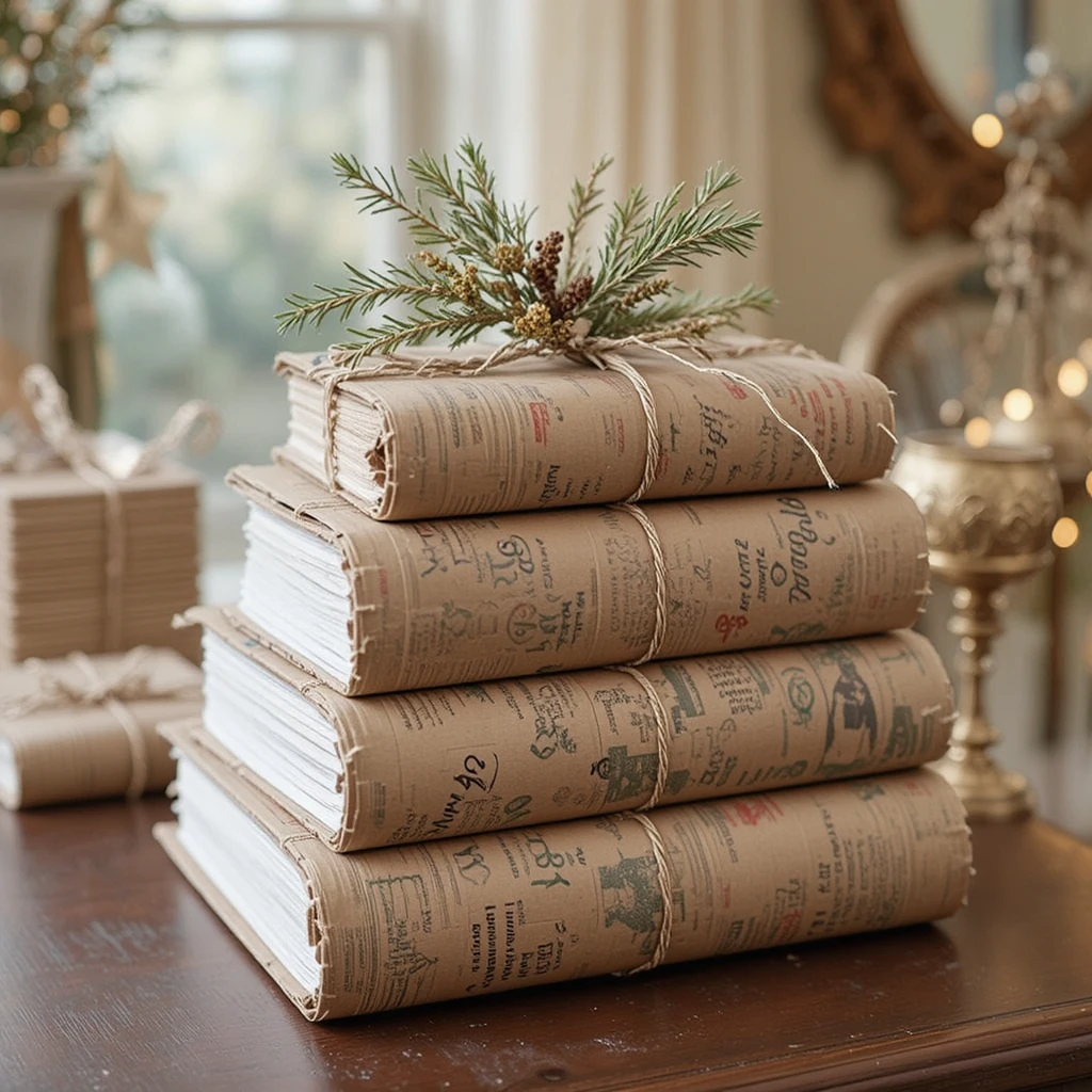 Cover books in brown craft paper or old wrapping paper and stack them on side tables. Tie them with twine and add a sprig of evergreen for an easy decorative display.