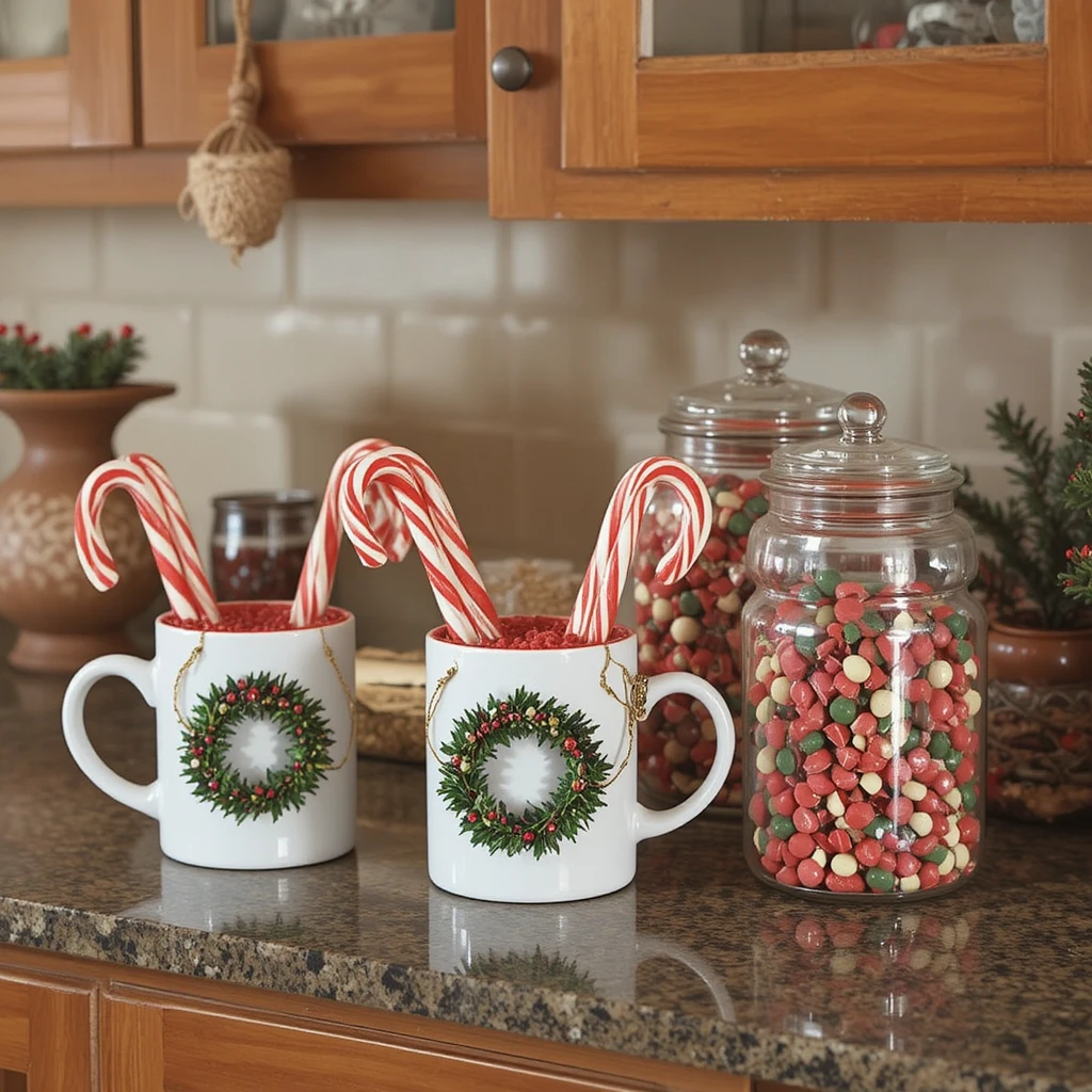 Add festive cheer to your kitchen by placing candy canes in mugs, filling jars with red and green candies, or hanging mini wreaths on cabinet doors for an inexpensive seasonal upgrade.