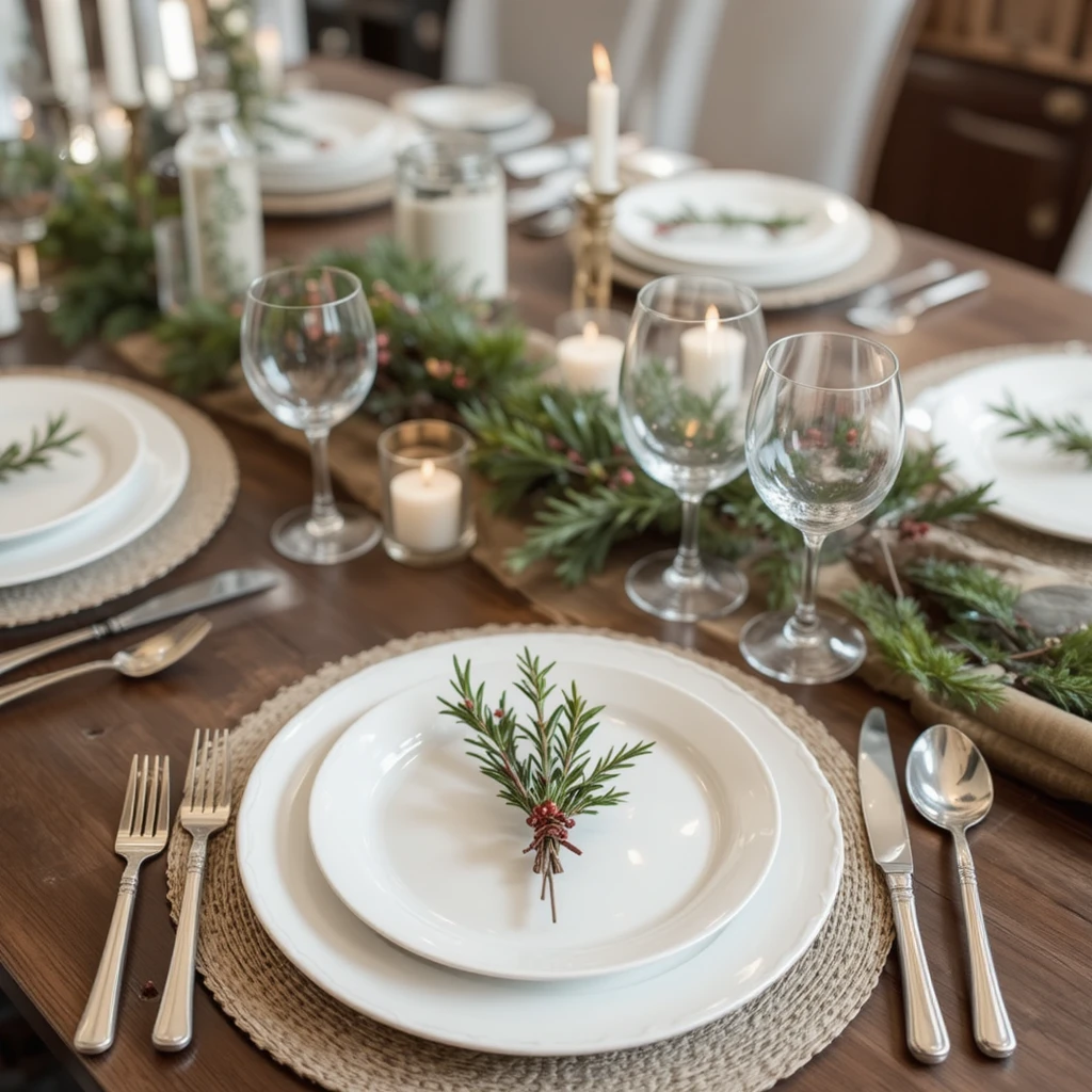 For holiday dinners, set the table with plain white plates and accent them with sprigs of rosemary or holly. This simple touch creates an elegant, fresh, and budget friendly Christmas decor idea that guests will admire.