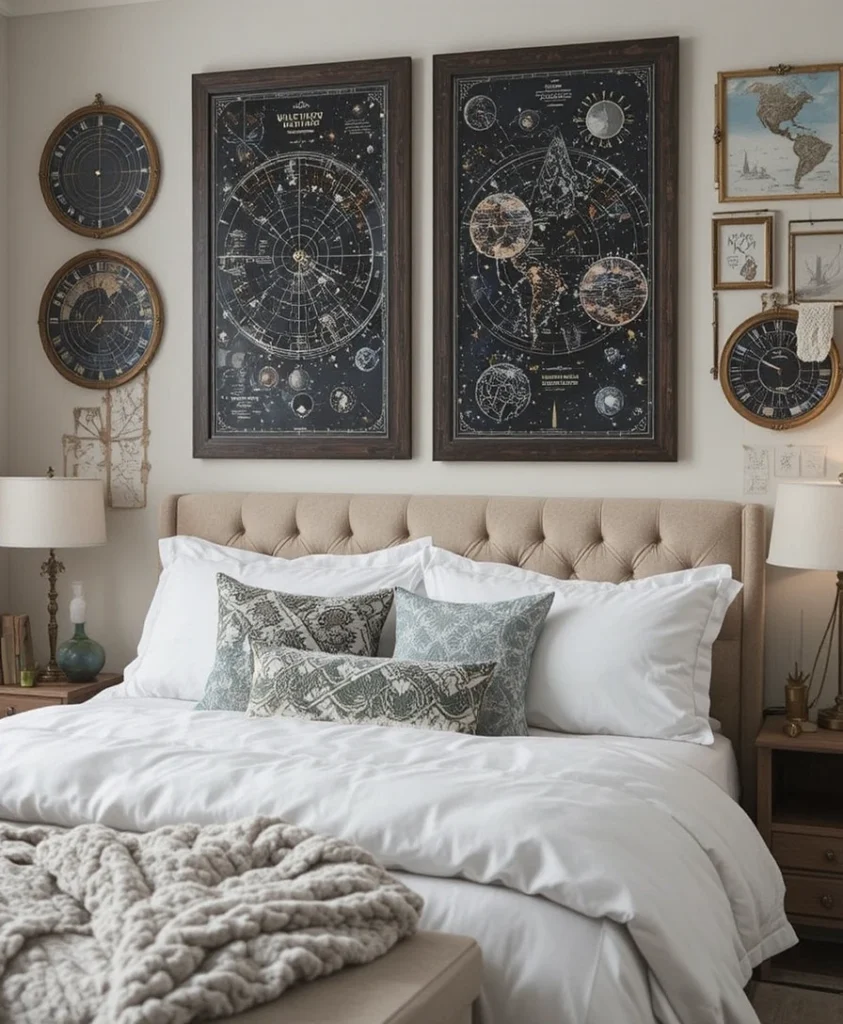 Framed star maps showing specific dates or locations personalize celestial bedroom ideas 2026. This décor choice blends sentimentality with sophistication, making the bedroom feel meaningful. Arranged in a gallery style, star maps add structure and visual storytelling to blank walls.