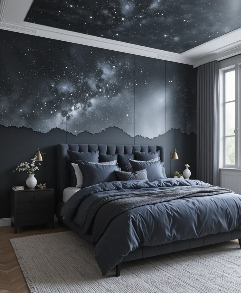 Matte wall finishes in deep charcoal or navy evoke the night sky with modern sophistication. This is a bold yet calming approach to celestial bedroom ideas 2026, perfect for contemporary homes. Soft furnishings and warm lighting prevent the space from feeling too dark.