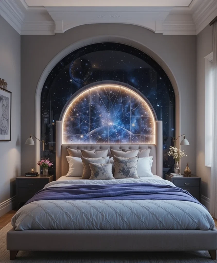 Headboards with arched shapes or embedded lighting echo planetary forms. This idea adds architectural interest to celestial bedroom ideas 2026 while keeping the design cohesive. Upholstered versions enhance comfort and soften the overall look.